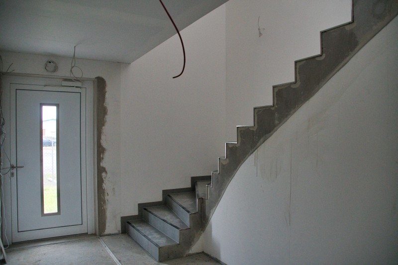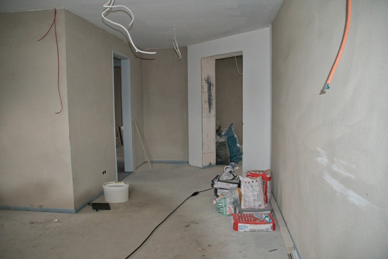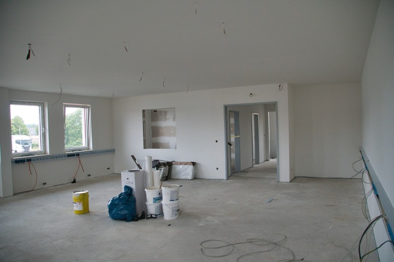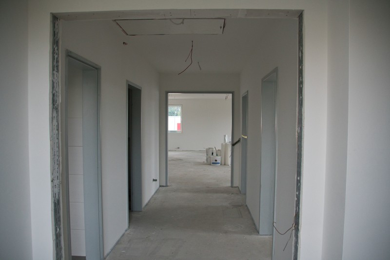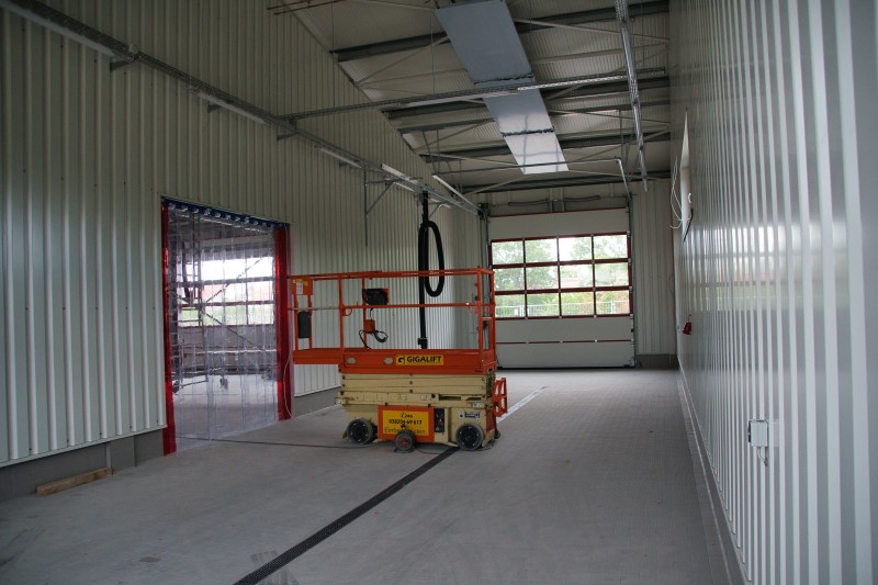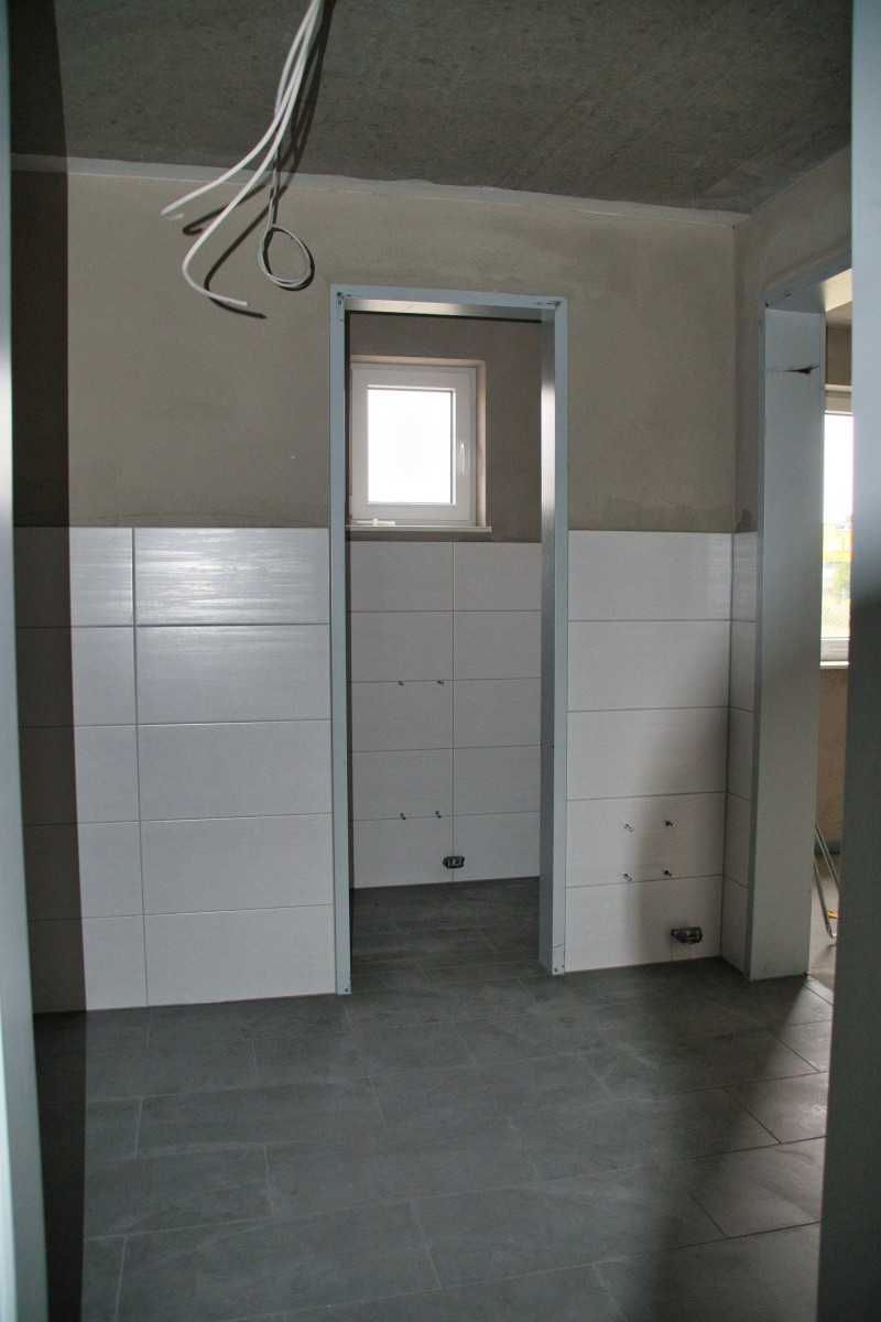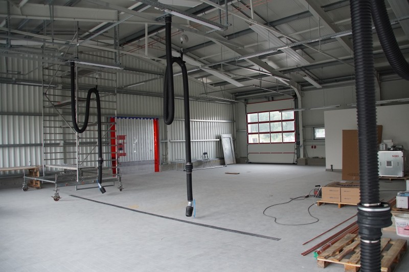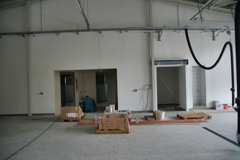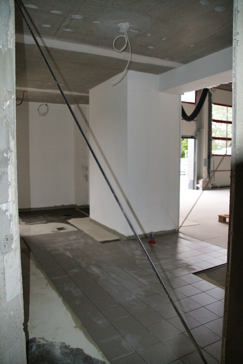 Inzwischen hat sich wieder einiges getan. So wurden unter anderem der komplette Fußboden aufgefüllt, die Wände verputzt und zum Teil schon Weiß gestrichen, sowie die Sanitärräume, die Treppenstufen und die Küche wurden gefließt. Auch in der Fahrzeughalle wurde kräftig weiter gearbeitet. Der Boden und die Wände (Waschhalle) sind auch fertig gefließt und die Zwischenwand zur Waschhalle wurde eingebaut. Ebenso ist auch die Abgasabsauganlage verbaut.