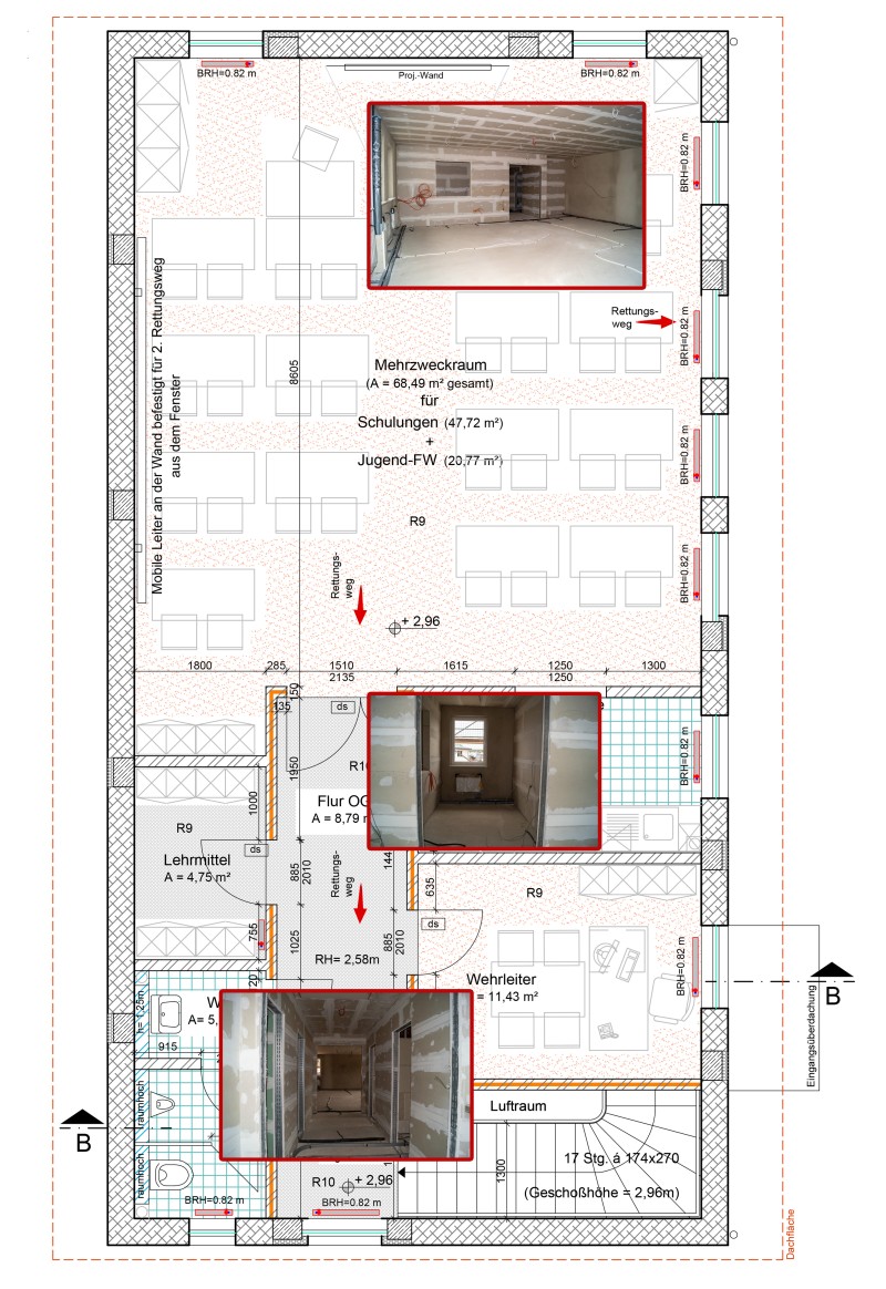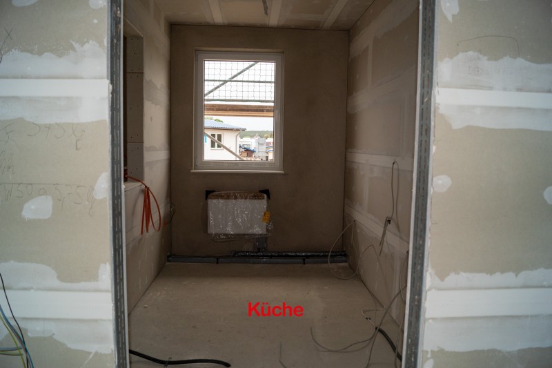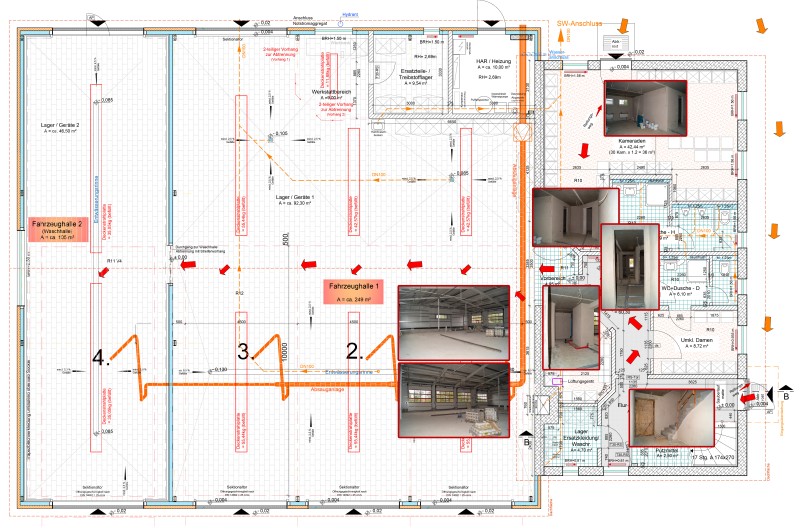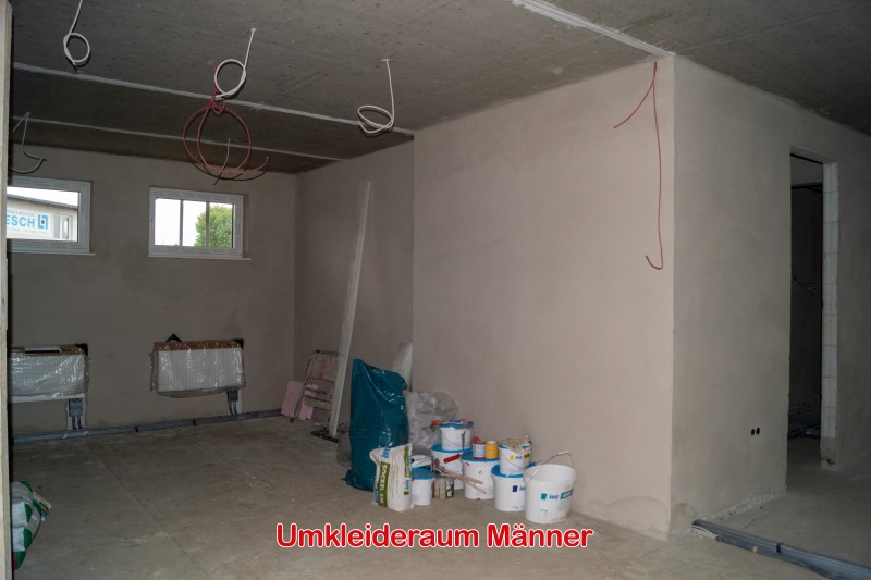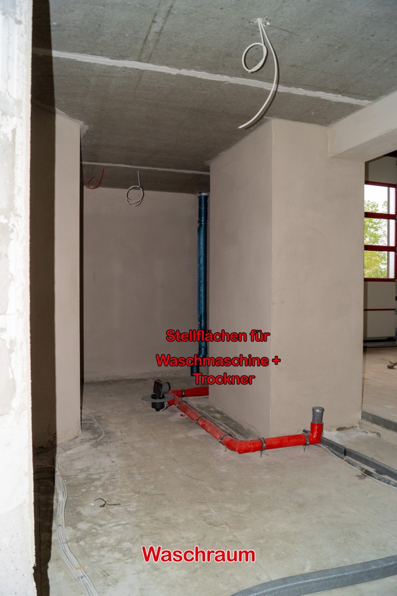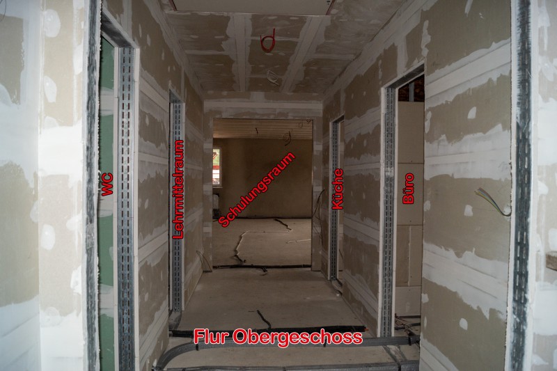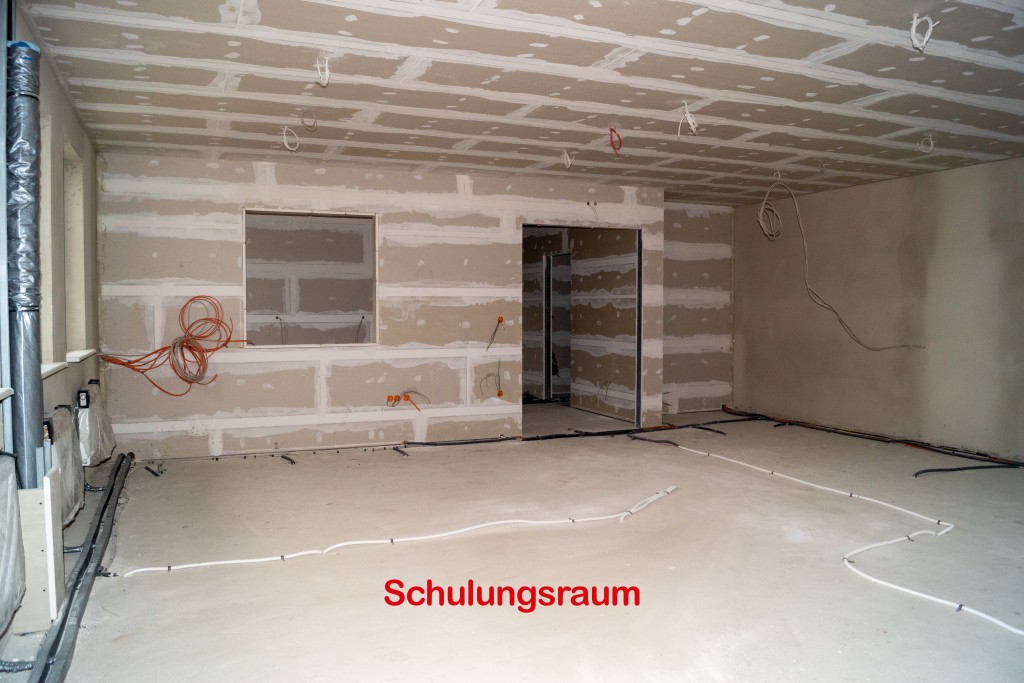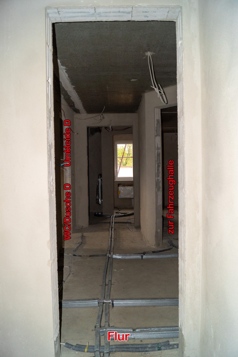 Heute möchten wir euch gerne zu einem kleinen Rundgang durch unser neues Feuerwehrgebäude mitnehmen und euch zeigen, wie es aktuell im Gebäude ausschaut. Wo sich jetzt noch zahlreiche Kabelschächte auf dem Boden durch das Gebäude schlängeln, kommen in den nächsten Tagen noch einmal ca. 18 cm Fußboden oben drauf. In der Waschhalle wurden bereits die Fliesen verlegt, jetzt folgen die Fliesenarbeiten auch in der Fahrzeughalle. In beiden Hallen werden dann zukünftig unsere Fahrzeuge auf hellgrauen Steinfliesen parken dürfen.