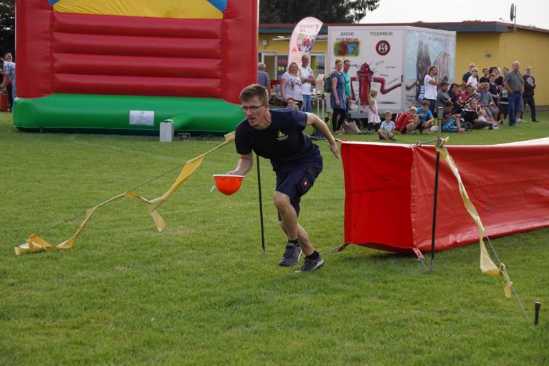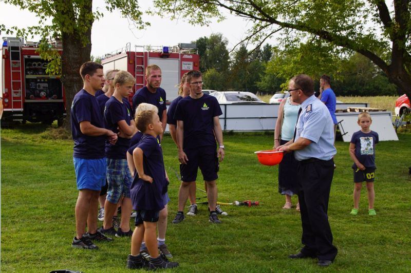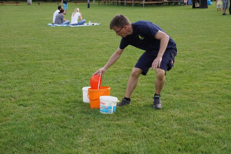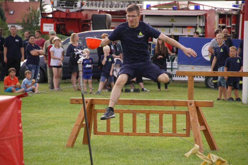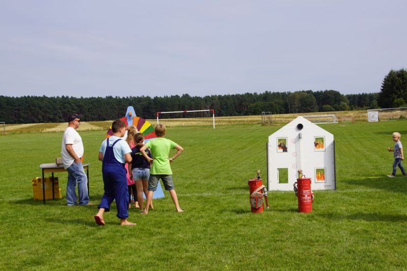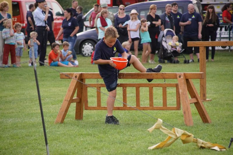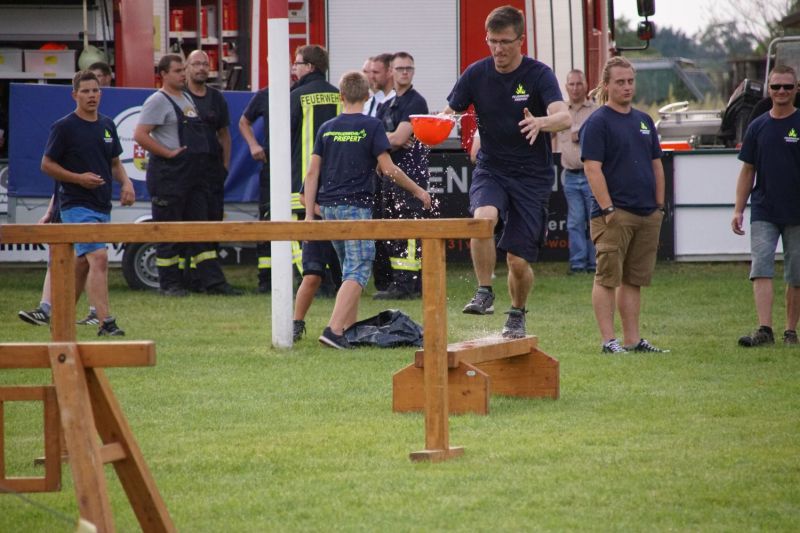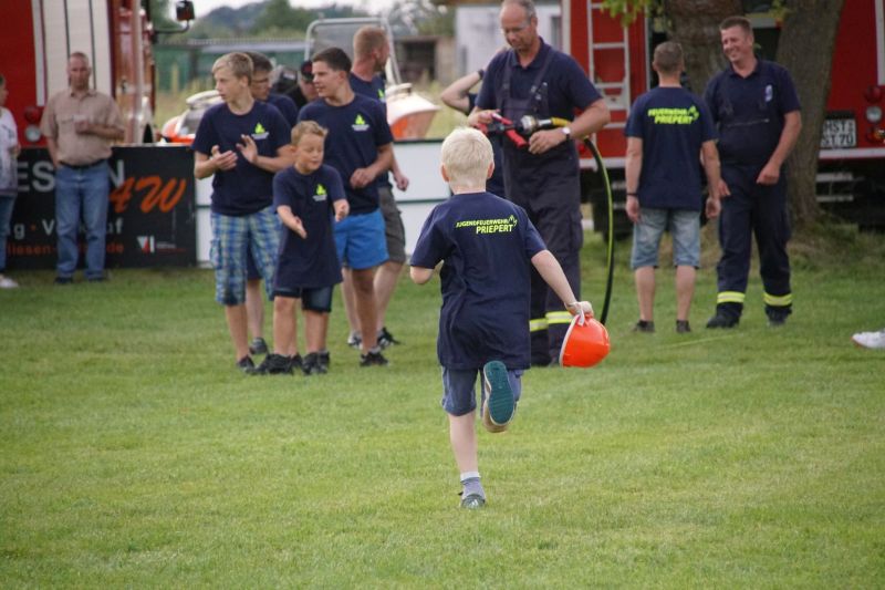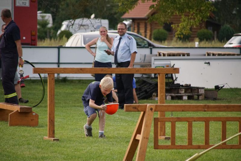 In einem Wettstreit zwischen der Jugendfeuerwehr Priepert und der Einsatzabteilung ging es darum, wer mit einem Helm der Jugendfeuerwehr mehr Wasser über eine Hindernisbahn ins Ziel zum Eimer schafft. Hier ging der Sieg eindeutig an die Jugendfeuerwehr Priepert.