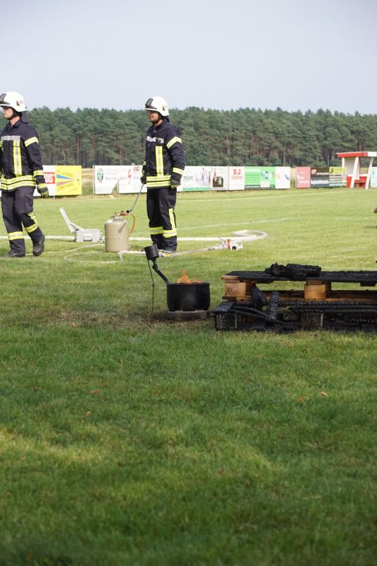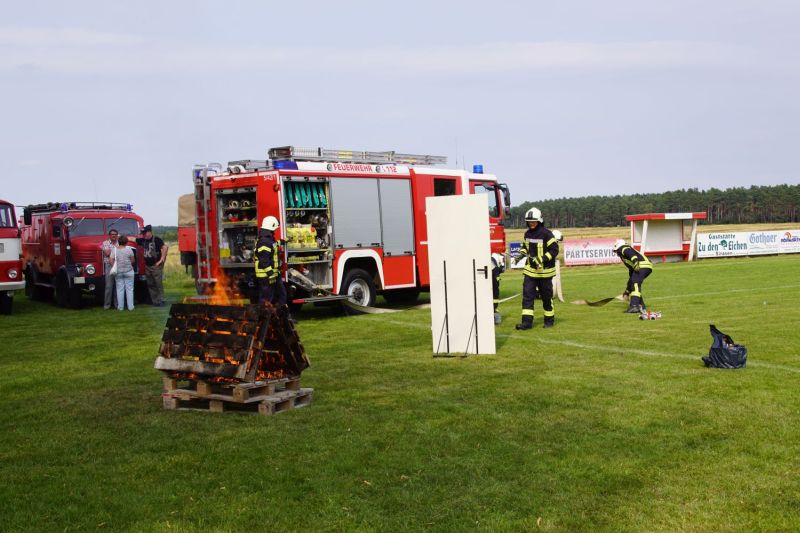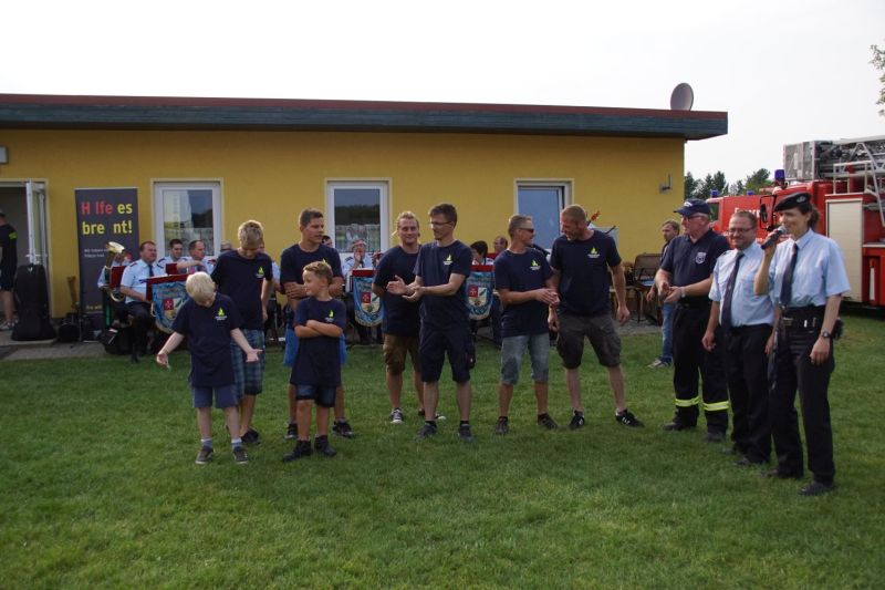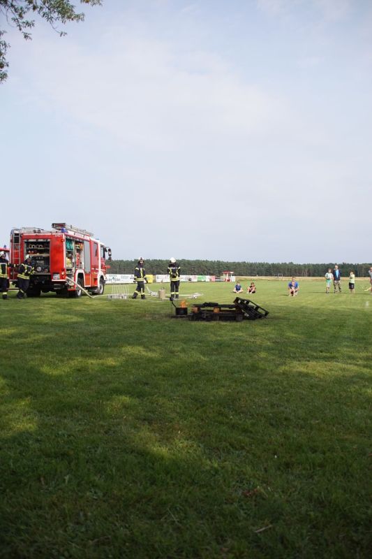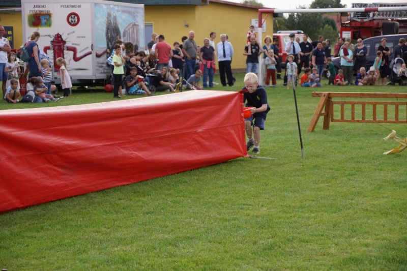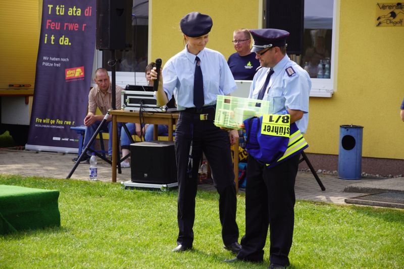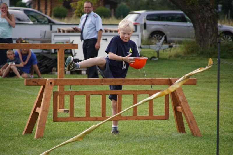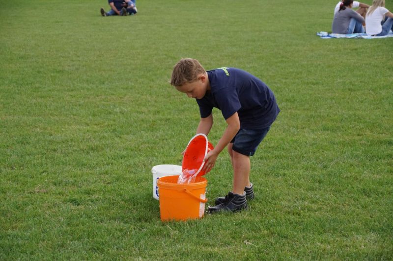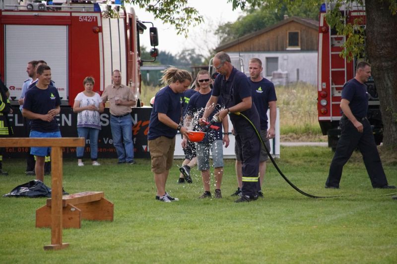 In einem Wettstreit zwischen der Jugendfeuerwehr Priepert und der Einsatzabteilung ging es darum, wer mit einem Helm der Jugendfeuerwehr mehr Wasser über eine Hindernisbahn ins Ziel zum Eimer schafft. Hier ging der Sieg eindeutig an die Jugendfeuerwehr Priepert.