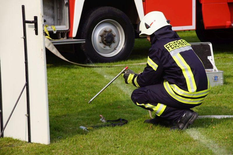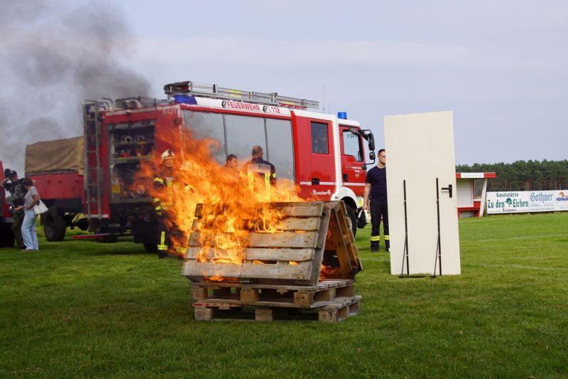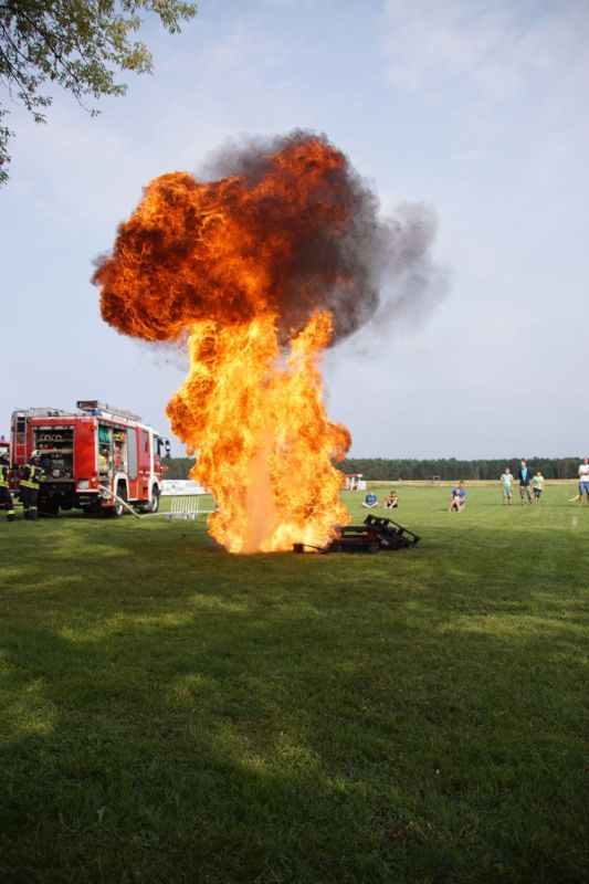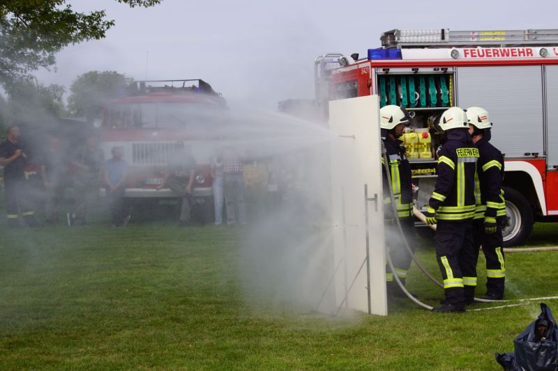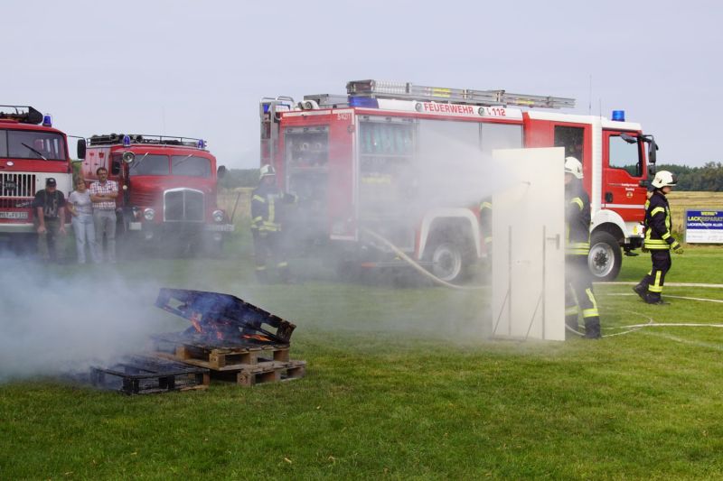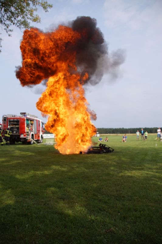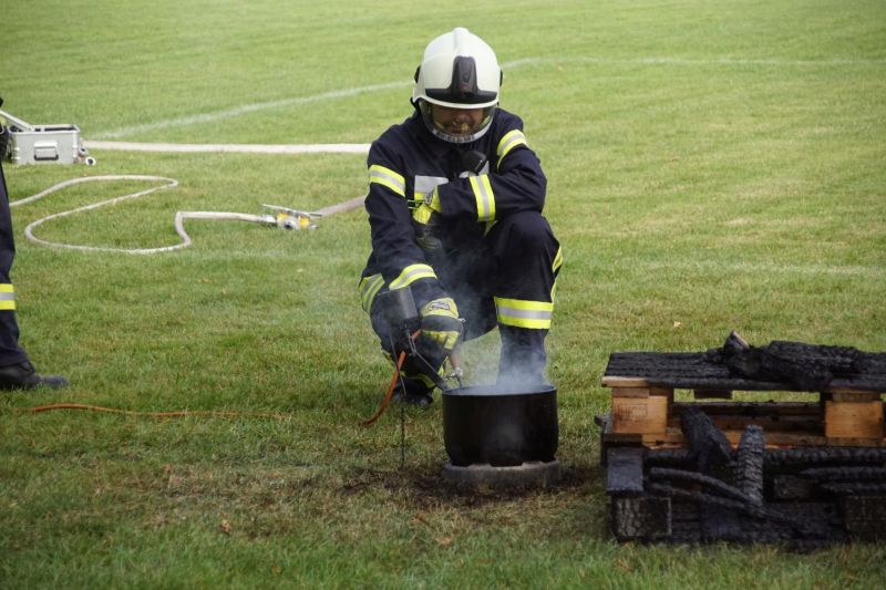 In zwei aufeinander folgende Vorführungen zeigten wir einmal die Löschtechnik bei einem Wohnungsbrand mit unseren Fog-Nails und zum anderen was passiert, wenn man brennendes Öl mit Wasser löscht.