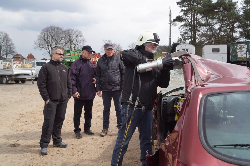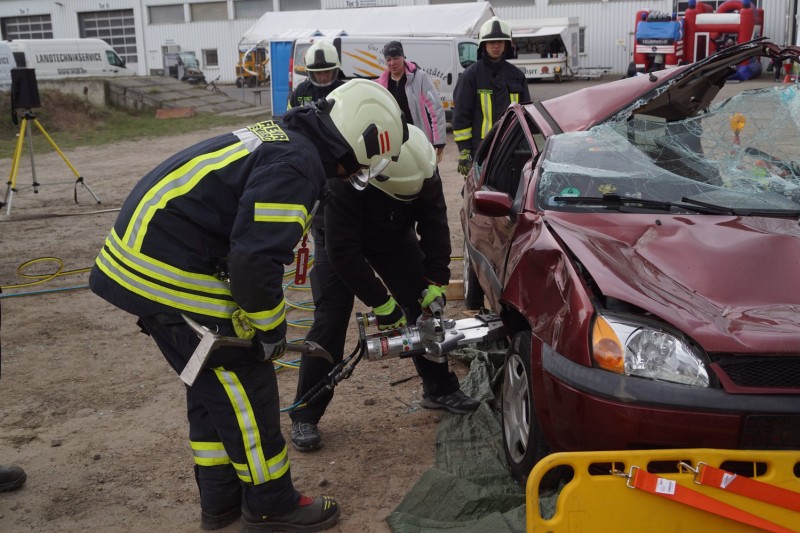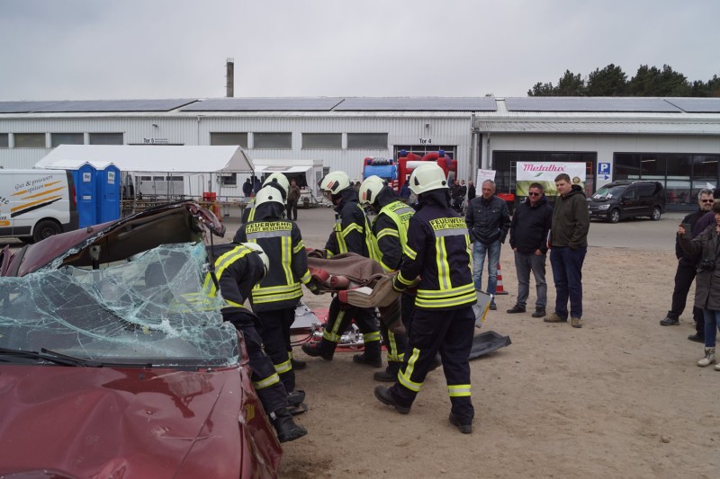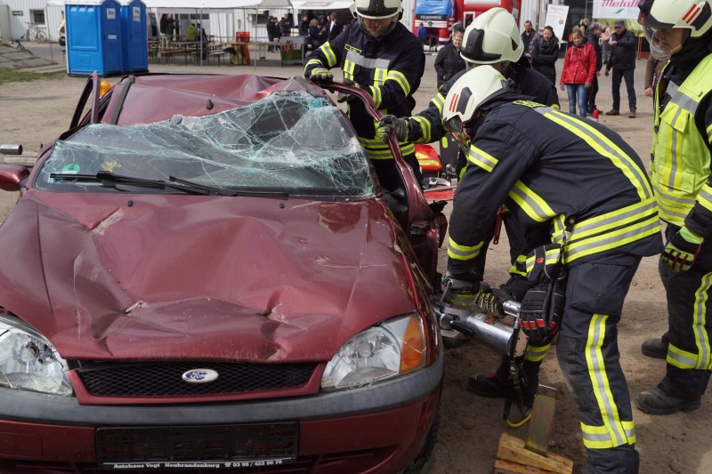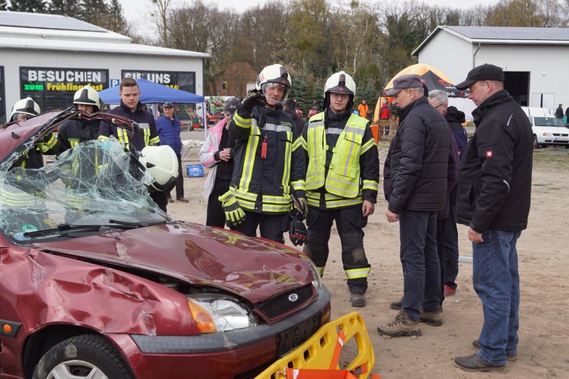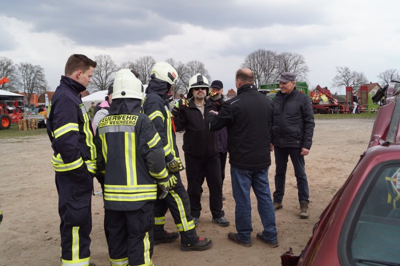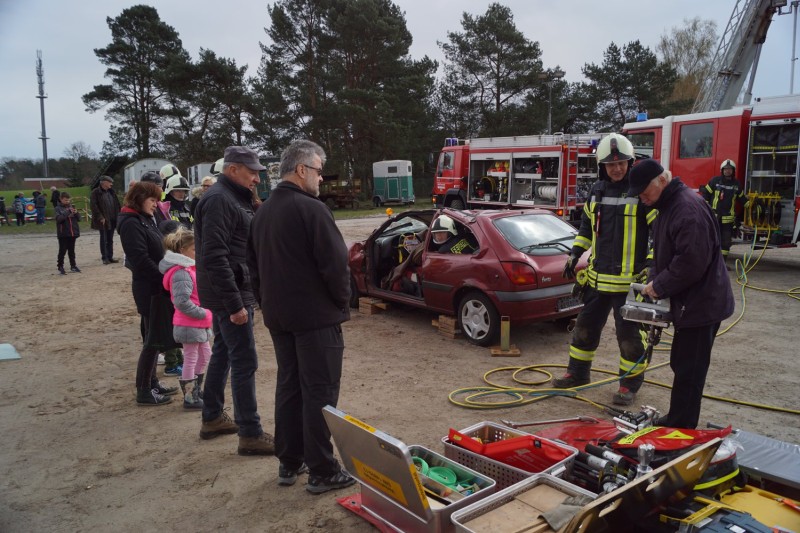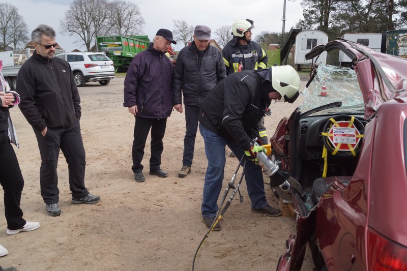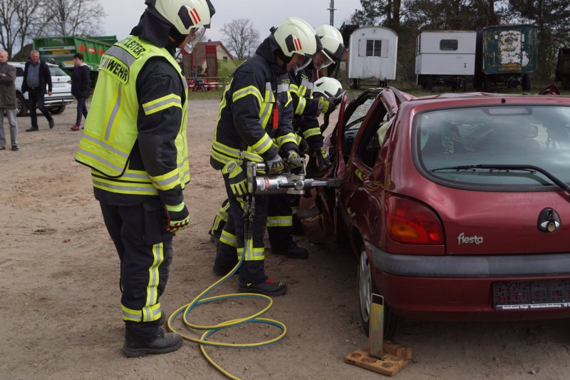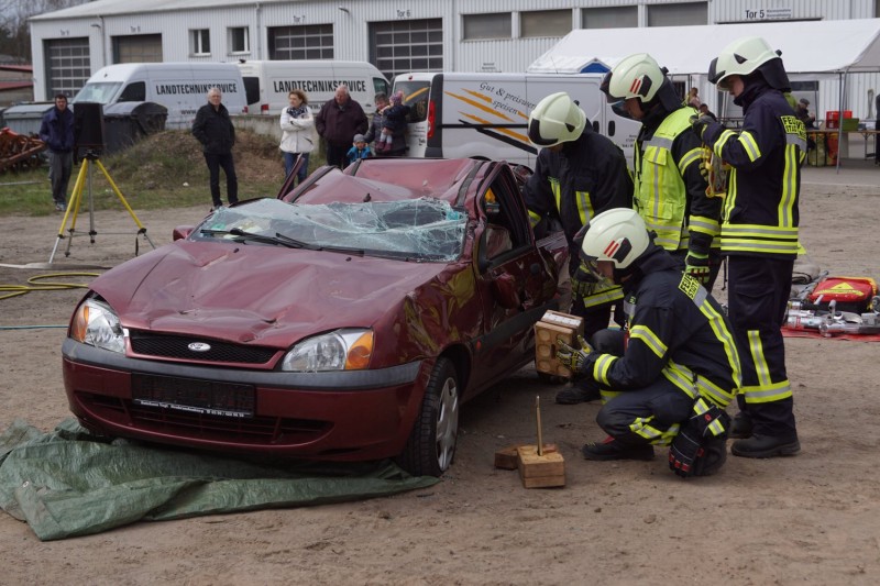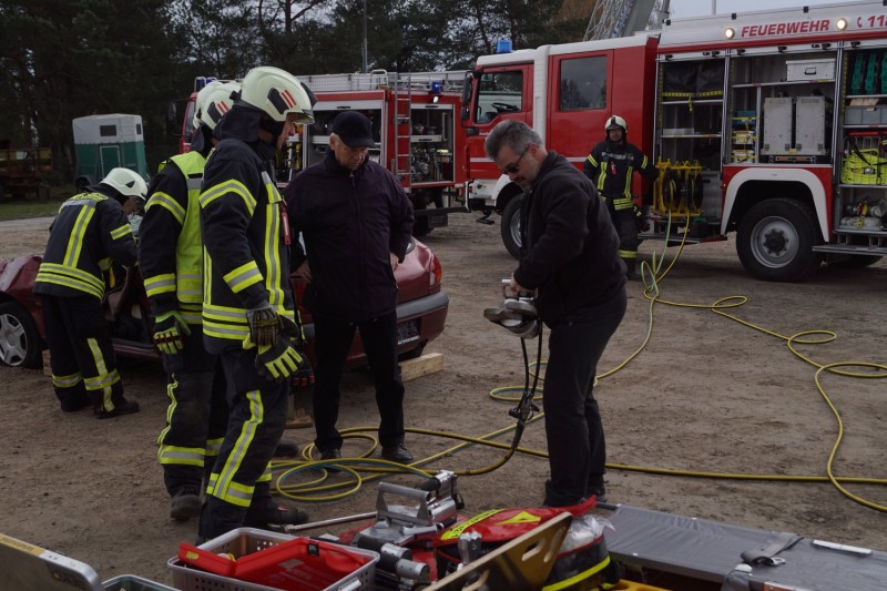 Für unsere Schauvorführung wurden im Vorfeld nicht nur alle Technischen Gerätschaften, die für eine Technische Hilfeleistung aus einem verunfallten Pkw gebraucht werden, bereit gelegt, sondern auch die "Einsatzstelle" abgesichert. Während der "Personenrettung" wurde den anwesenden Gästen auch die Gelegenheit gegeben, sich während einer kurzen Pause das Unfallfahrzeug aus der Nähe an zu schauen und sich die Technik erklären zu lassen. Unter den Zuschauern waren nicht nur unser Bürgermeister Helmut Hamp und die CDU-Stadtvertreter Harry Frank, Steffen Rißmann und Thomas Zander, auch mit einigen anwesenden Kameraden aus der Feuerwehr Wulkenzin konnten Fachgespräche geführt werden. Im Anschluss nahmen Thomas Zander und Steffen Rißmnann selber die schwere Einsatztechnik Schere und Spreizer in die Hand und ergriffen die Gelegenheit, damit zu arbeiten.