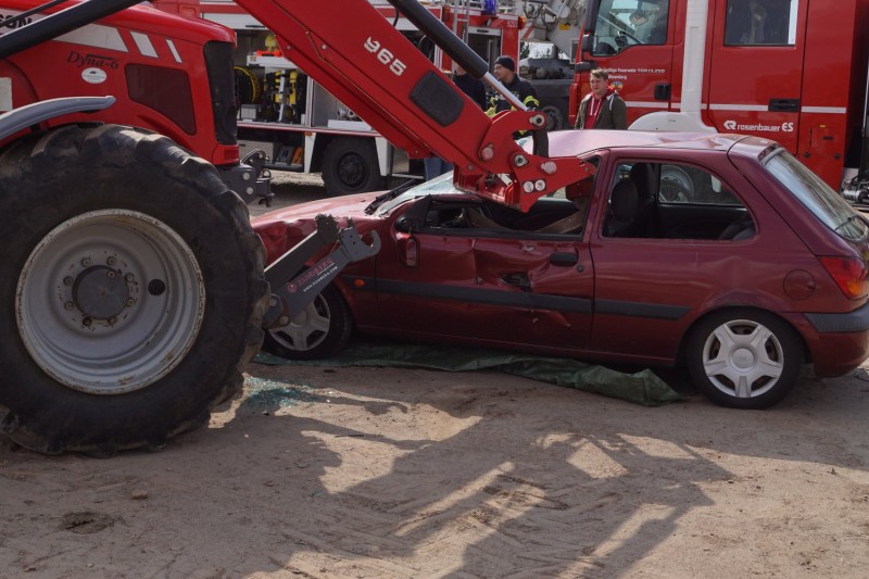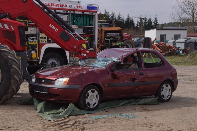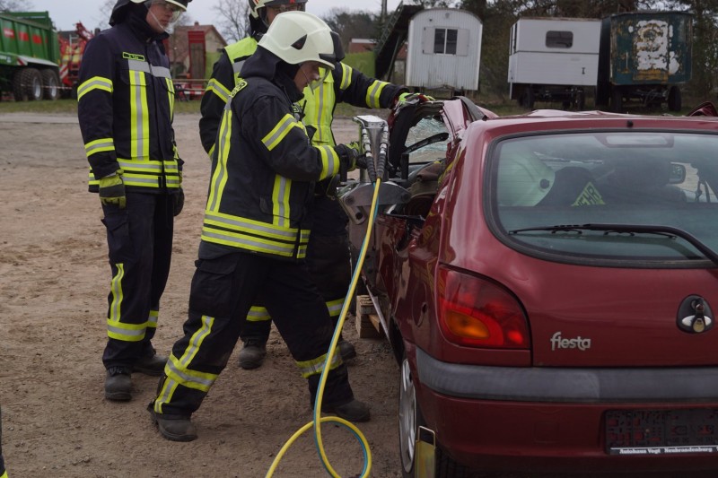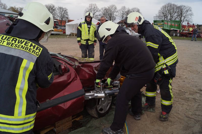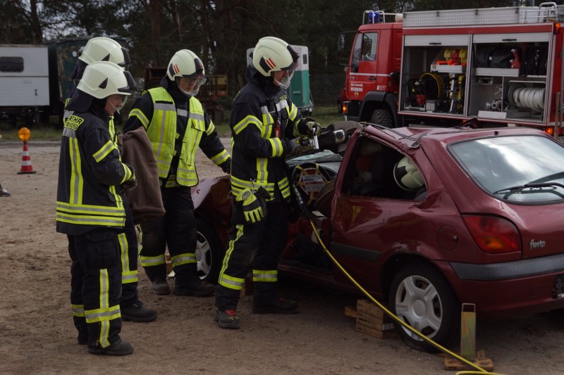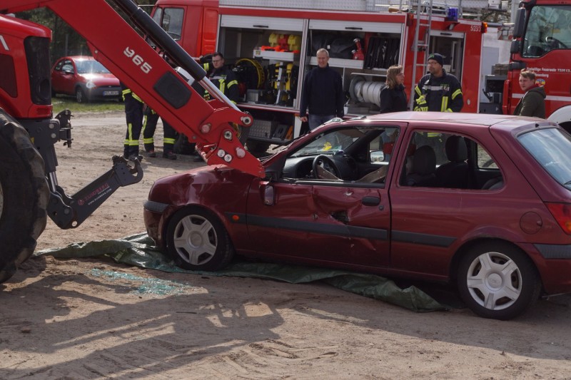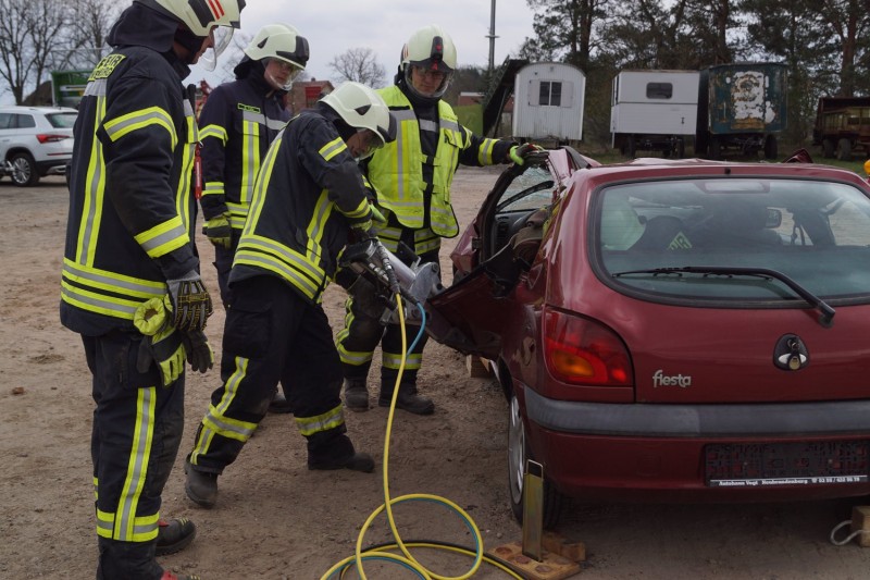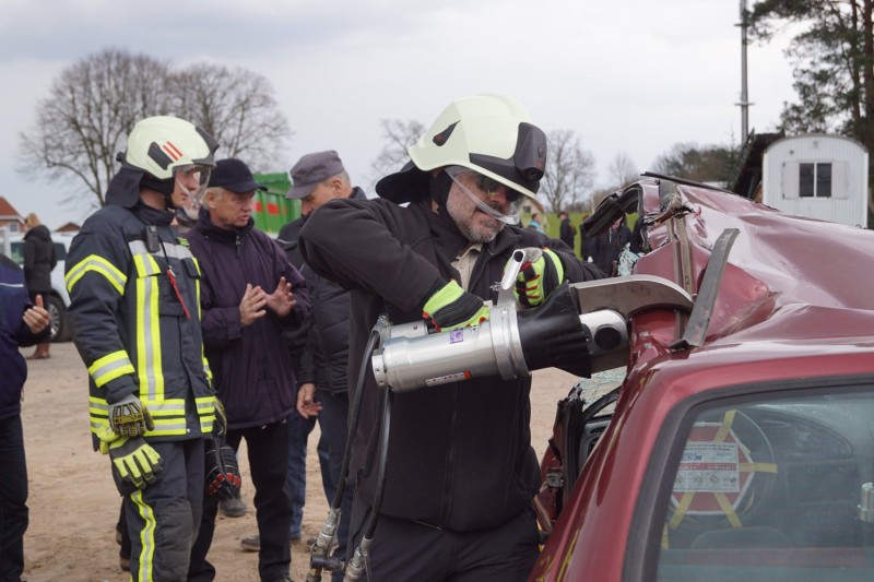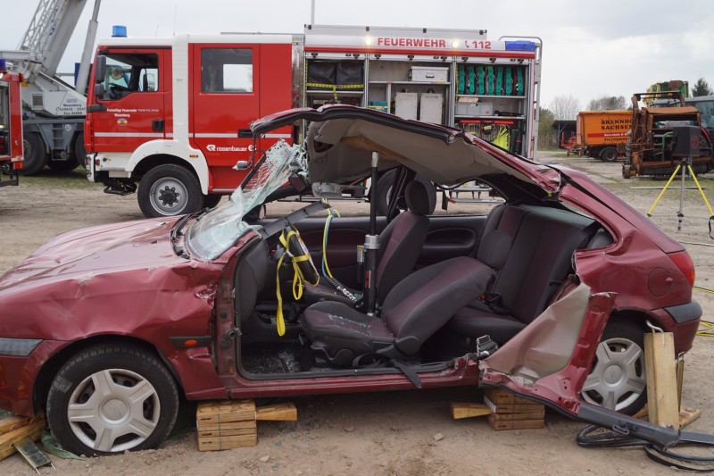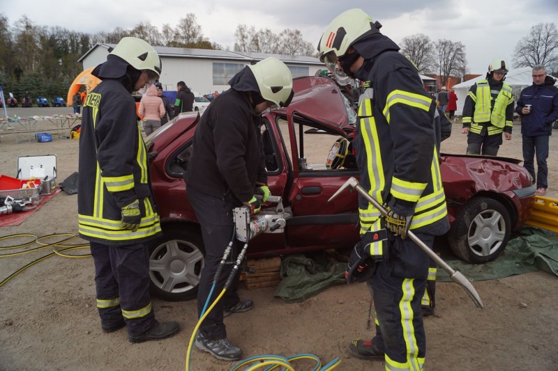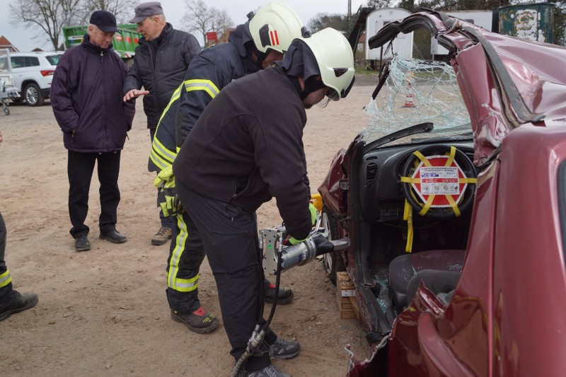 Für unsere Schauvorführung wurden im Vorfeld nicht nur alle Technischen Gerätschaften, die für eine Technische Hilfeleistung aus einem verunfallten Pkw gebraucht werden, bereit gelegt, sondern auch die "Einsatzstelle" abgesichert. Während der "Personenrettung" wurde den anwesenden Gästen auch die Gelegenheit gegeben, sich während einer kurzen Pause das Unfallfahrzeug aus der Nähe an zu schauen und sich die Technik erklären zu lassen. Unter den Zuschauern waren nicht nur unser Bürgermeister Helmut Hamp und die CDU-Stadtvertreter Harry Frank, Steffen Rißmann und Thomas Zander, auch mit einigen anwesenden Kameraden aus der Feuerwehr Wulkenzin konnten Fachgespräche geführt werden. Im Anschluss nahmen Thomas Zander und Steffen Rißmnann selber die schwere Einsatztechnik Schere und Spreizer in die Hand und ergriffen die Gelegenheit, damit zu arbeiten.