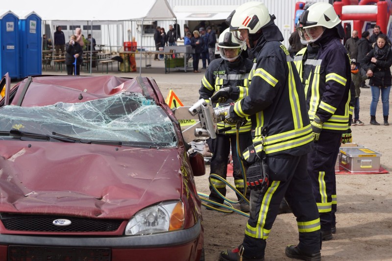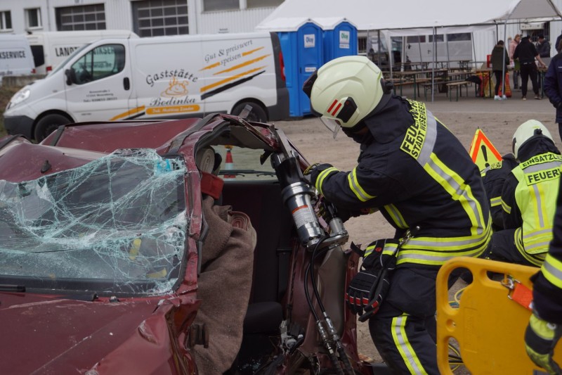 Auf dem Plan stand auch wieder eine Schauvorführung in der Technischen Hilfeleistung bei Verkehrsunfällen, da aber im Vorfeld erst einmal das Fahrzeug so manipuliert werden musste, dass es auch nach einem Unfall aussieht, stand uns hierfür erneut Geschäftsführer Stefan Müller mit einem passenden Fahrzeug zu Seite und sorgte somit auch für eine weitere zusätzliche Attraktion für Groß und Klein.