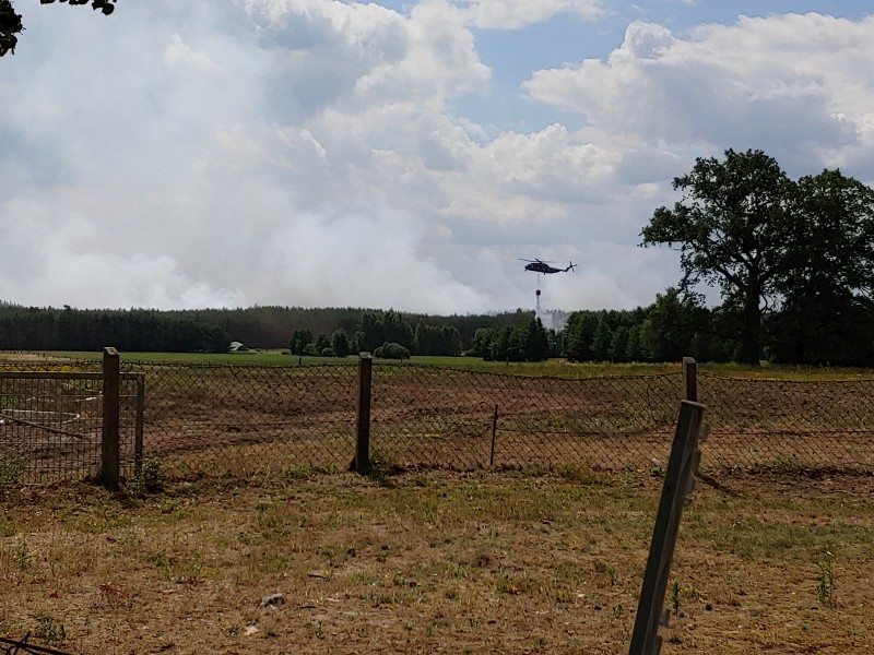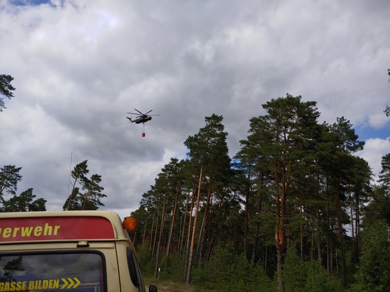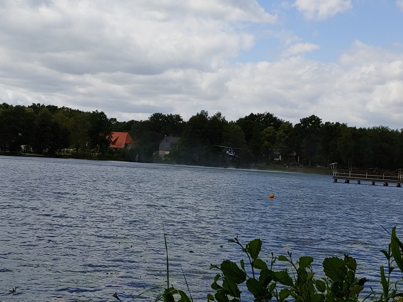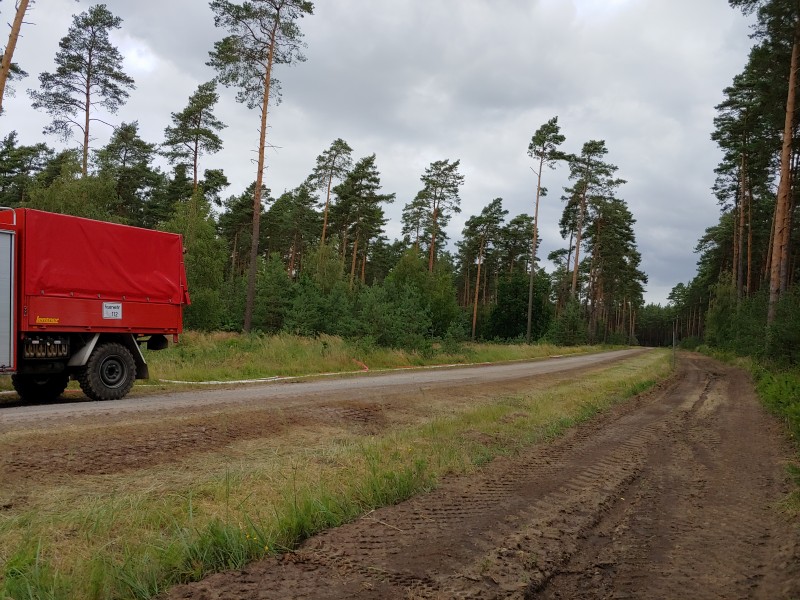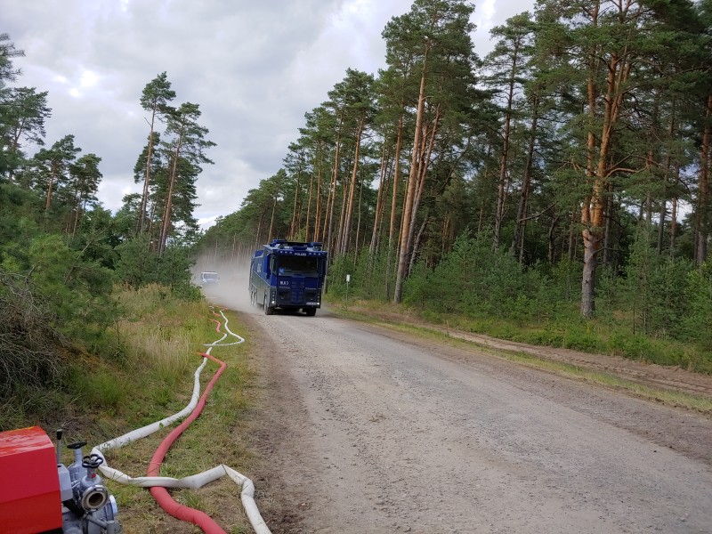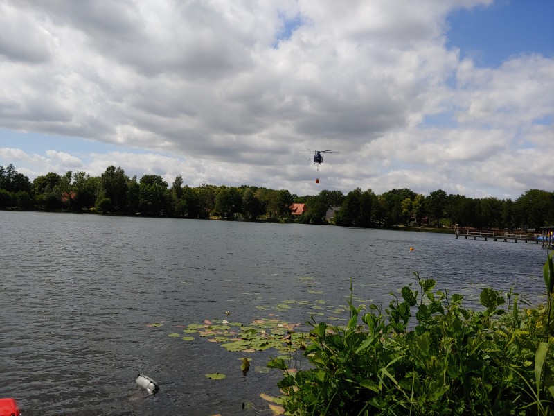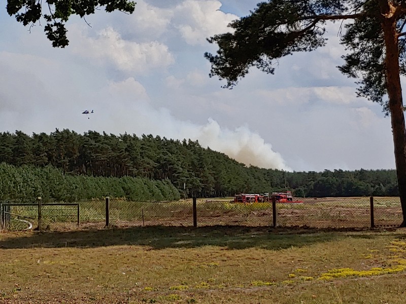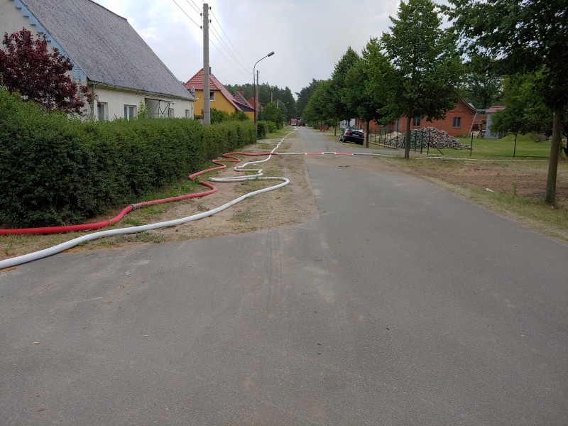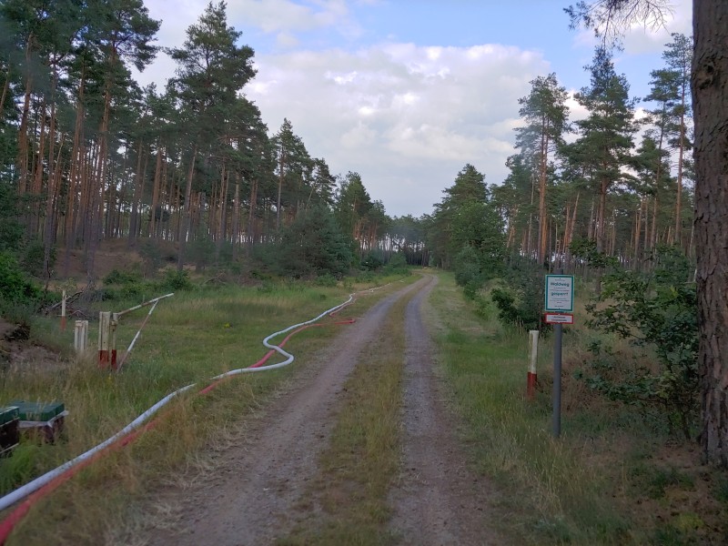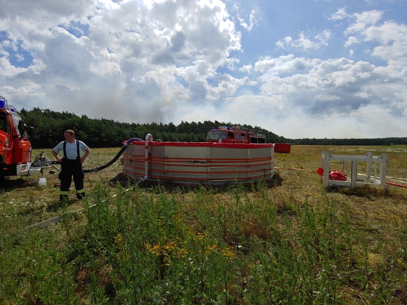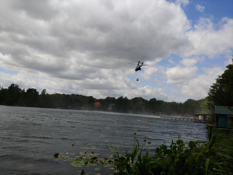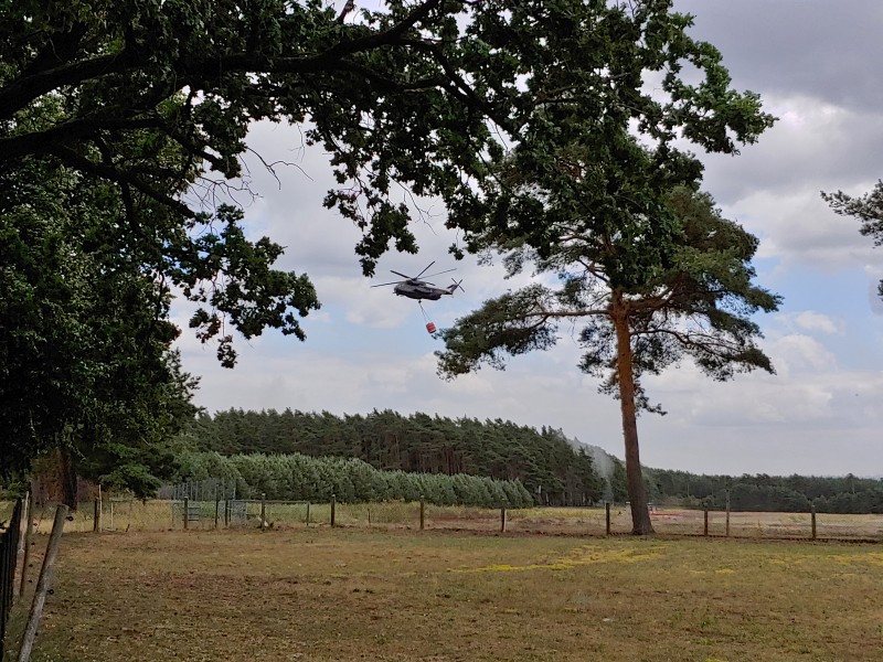 Von dort aus wurde am ersten Tag unser Löschzug geteilt. Während die einen nach Alt Jabel geschickt wurden, rückten wir mit unserer Einheit und weiteren Feuerwehrkräften (86 Frauen und Männer, 19 Einsatzfahrzeuge) nach Trebs aus, welcher zu diesem Zeitpunkt gerade evakuiert wurde. Hier lösten wir im Einsatz befindliche Feuerwehrkräfte aus. Nach einer kurzen Einsatzbesprechung war unsere Aufgabe der Schutz des Ortes Trebs vor dem nahe kommenden Feuer. Wir unterstützten mit unserem Schlauchwagen (2.000 Meter Schlauchmaterial) bei der Herstellung der Wasserversorgung für ein 50.000 Liter fassenden Wasserbehälter und unseren 10.000 Liter fassenden Faltbehälter. Für diese zweifache Schlauchleitung waren insgesamt 3 dieser Schlauchwagen notwendig. Zum Schutz des Ortes wurden hier am Waldrand sogenannte Riegelstellung aufgebaut, die von unserem Löschzug übernommen und weiter ausgebaut wurde. Die Bundeswehr und die Bundespolizei waren auch bei uns mit mehreren Hubschraubern in der Waldbrandbekämpfung aus der Luft im Einsatz. Die Brandfläche stieg weiter auf über 600 Hektar an. Gegen 19:00 Uhr wurden auch wir abgelöst und machten uns anschließend auf dem Weg zur Bundeswehrkaserne nach Hagenow, wo wir in der Sporthalle mit weiteren Einsatzkräften über Nacht etwas Ruhe fanden.