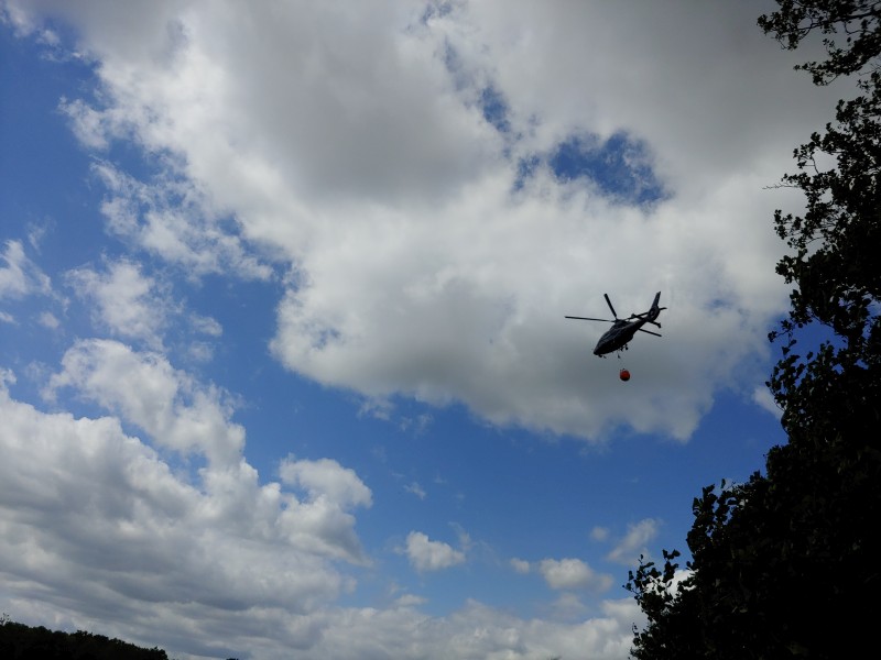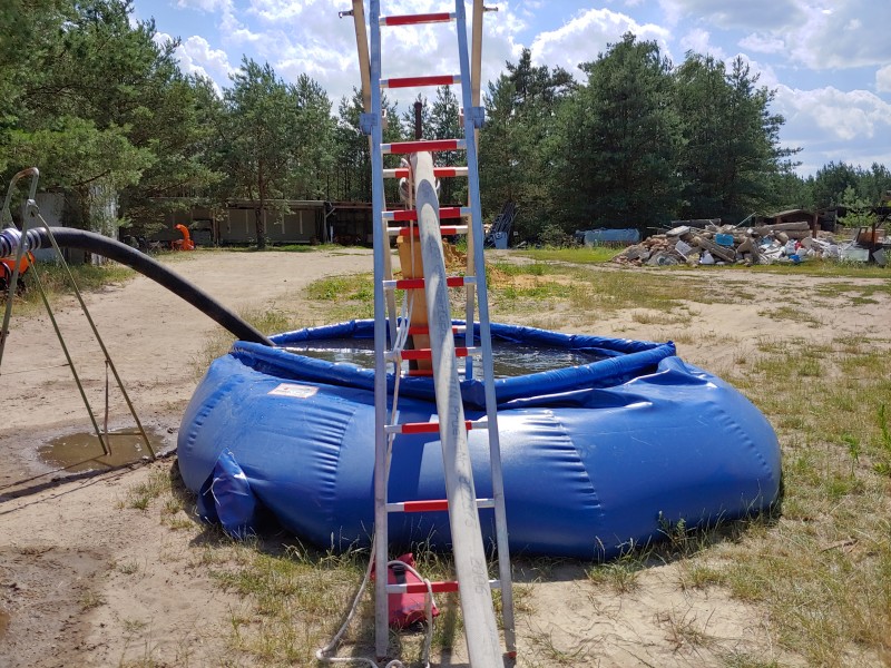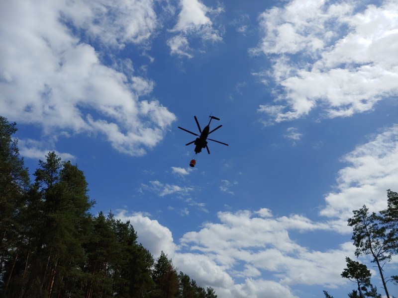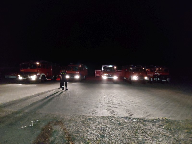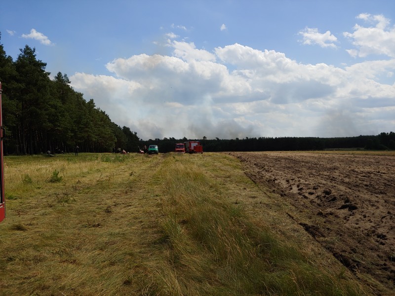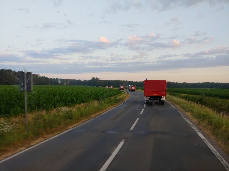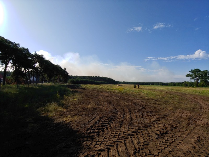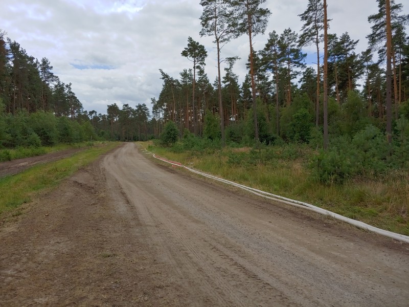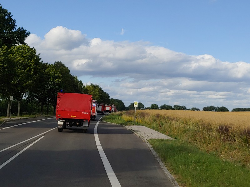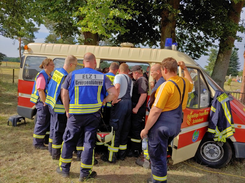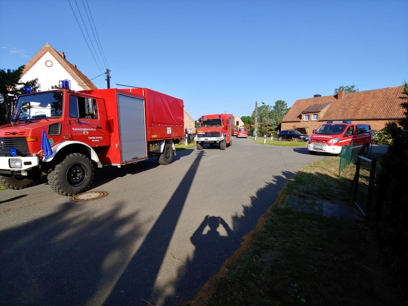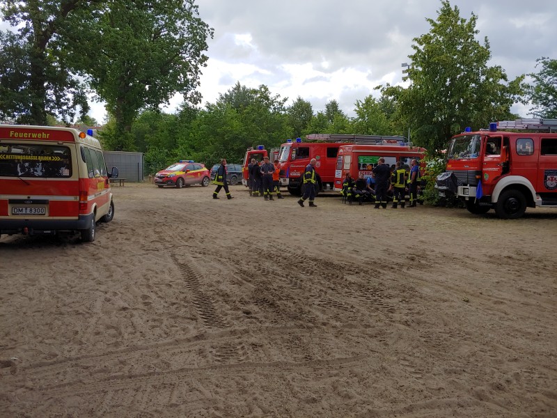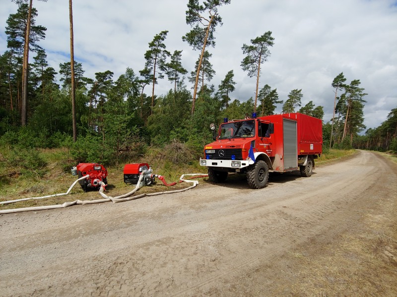 Von dort aus wurde am ersten Tag unser Löschzug geteilt. Während die einen nach Alt Jabel geschickt wurden, rückten wir mit unserer Einheit und weiteren Feuerwehrkräften (86 Frauen und Männer, 19 Einsatzfahrzeuge) nach Trebs aus, welcher zu diesem Zeitpunkt gerade evakuiert wurde. Hier lösten wir im Einsatz befindliche Feuerwehrkräfte aus. Nach einer kurzen Einsatzbesprechung war unsere Aufgabe der Schutz des Ortes Trebs vor dem nahe kommenden Feuer. Wir unterstützten mit unserem Schlauchwagen (2.000 Meter Schlauchmaterial) bei der Herstellung der Wasserversorgung für ein 50.000 Liter fassenden Wasserbehälter und unseren 10.000 Liter fassenden Faltbehälter. Für diese zweifache Schlauchleitung waren insgesamt 3 dieser Schlauchwagen notwendig. Zum Schutz des Ortes wurden hier am Waldrand sogenannte Riegelstellung aufgebaut, die von unserem Löschzug übernommen und weiter ausgebaut wurde. Die Bundeswehr und die Bundespolizei waren auch bei uns mit mehreren Hubschraubern in der Waldbrandbekämpfung aus der Luft im Einsatz. Die Brandfläche stieg weiter auf über 600 Hektar an. Gegen 19:00 Uhr wurden auch wir abgelöst und machten uns anschließend auf dem Weg zur Bundeswehrkaserne nach Hagenow, wo wir in der Sporthalle mit weiteren Einsatzkräften über Nacht etwas Ruhe fanden.