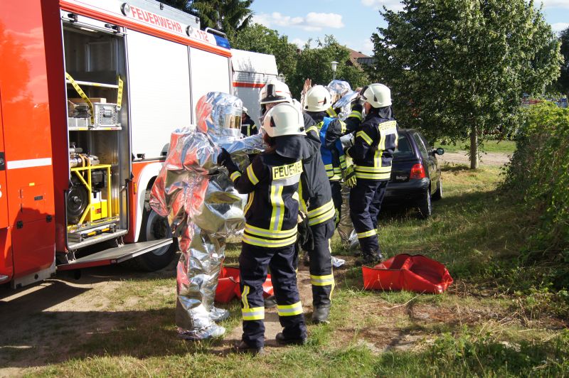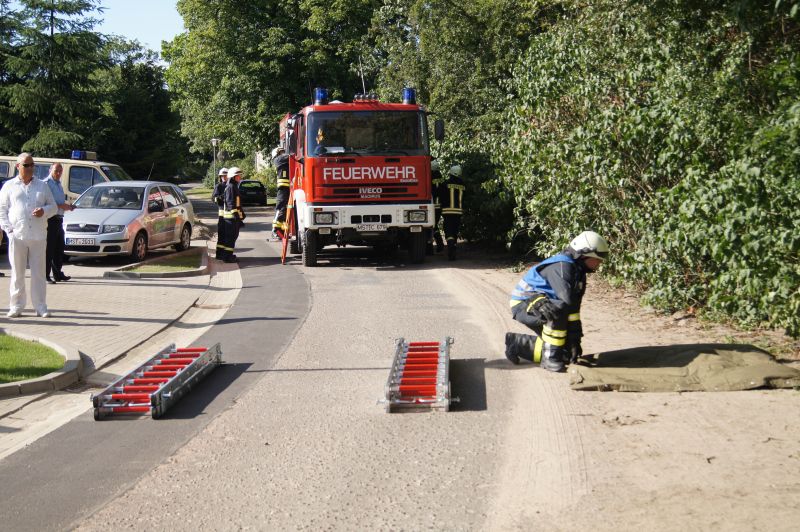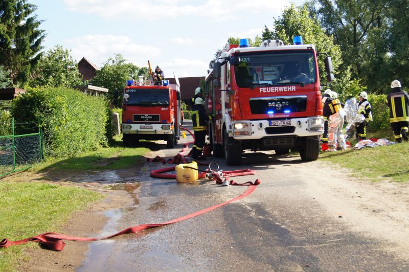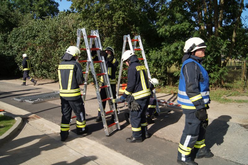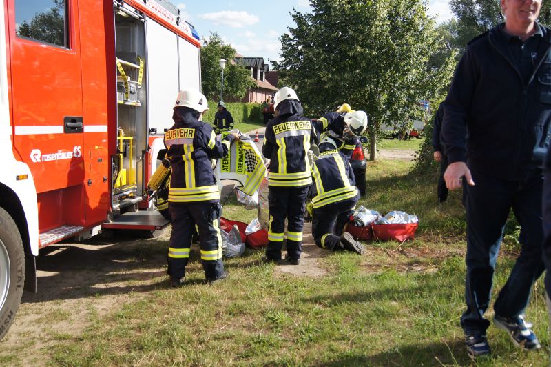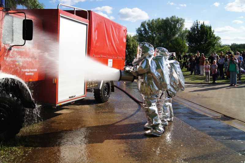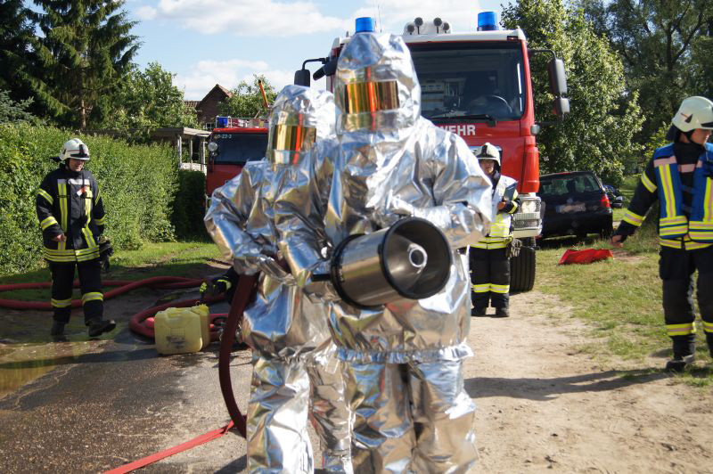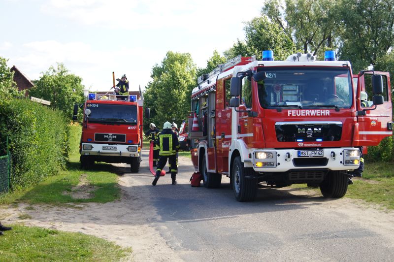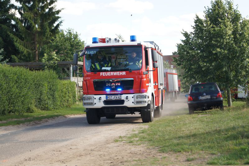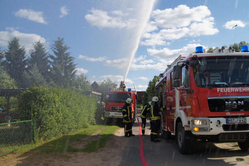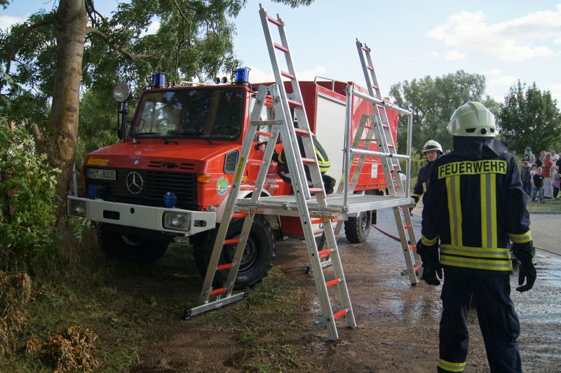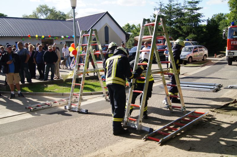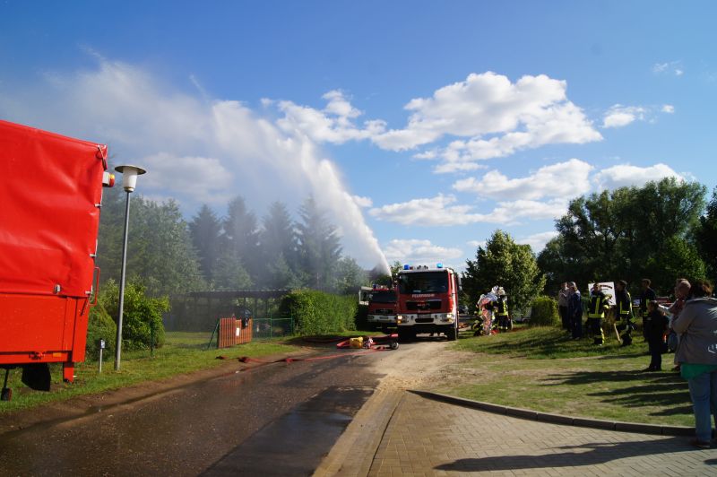Am heutigen Freitagnachmittag den 10.07.2015, nahmen auch wir an der feierlichen Übergabe des neuen Gerätehauses der Freiwilligen Feuerwehr Qualzow teil. Hier sollte jede Feuerwehr eine Vorführung machen und wir haben unsere zusammen mit der Feuerwehr Mirow gefahren. Wir haben ein Szenario gewählt, wie es jeden Tag auf unseren Straßen passieren kann. Ein Lkw prallt gegen einen Baum, fängt Feuer und der Fahrer ist noch in seinem Fahrerhaus eingeklemmt. Unsere Aufgabe war die Brandbekämpfung mittels Schaum und unter Wärmestrahlenschutzanzüge. Während die Kameaden aus Mirow ihre Rettungsplattform für die Menschenrettung aufbauten. Ein riesen Dank an alle Kameradinnen und Kameraden für ihre tolle gezeigte Einsatzbereitschaft.