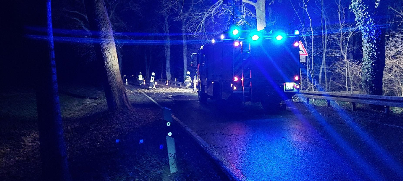 Unseren ersten Einsatz im Jahr 2022 bescherte uns das Sturmtief "Nadia" in der Nacht vom 29.01.2022 zum 30.01.2022, denn um 02:49 Uhr wurde unser Sondertrupp durch die Leitstelle mit dem Stichwort "TH klein, B122 kurz hinter Ortsausgang Wesenberg Richtung Wustrow, Baum auf Fahrbahn" alarmiert. Vor Ort bestätigte sich die Meldung und der quer über der Straße liegende Baum wurde mittels Motorkettensäge zerkleinert und die Fahrbahn beräumt.
