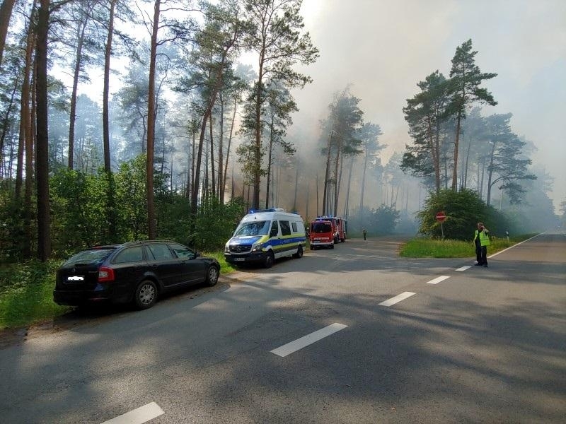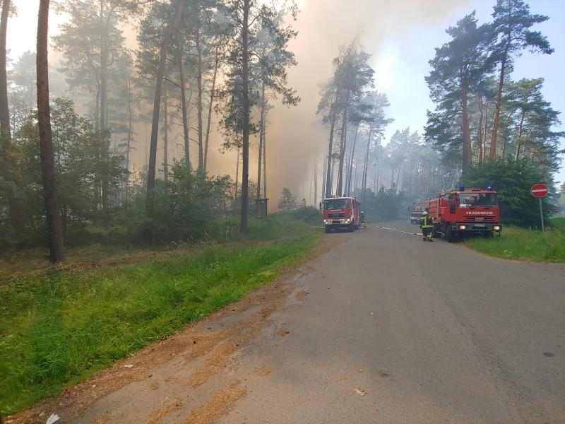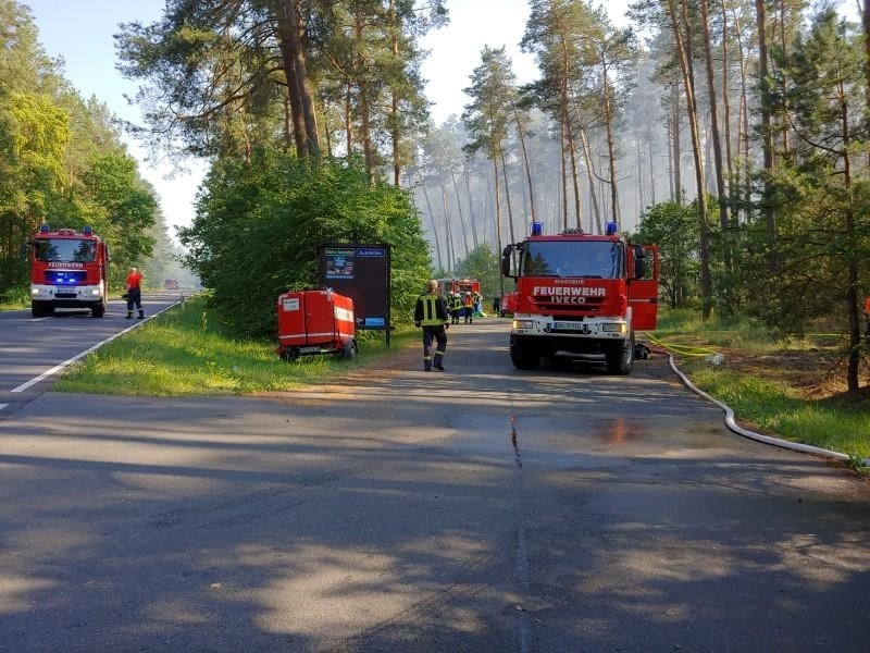 Heute Nachmittag wurden wir zusammen mit den Feuerwehren aus Wustrow, Strasen, Priepert und Mirow zu einem großen Waldbrand bei Priepert alarmiert. Auf der Anfahrt stellte sich dann heraus, dass sich dieser Waldbrand an der Bundesstraße 96 zwischen Godendorf und Fürstenberg am dortigen Parkplatz befand. Hier kämpften bereits die Feuerwehren aus Fürstenberg, Neustrelitz und Strelitz-Alt gegen die Flammen. Im Laufe des Einsatzes wurden weitere Kräfte aus dem Umkreis von Fürstenberg hinzu gerufen. Weil sich der Waldbrand unmittelbar neben der Bahnlinie nach Berlin befand, musste die Bahnstrecke für mehrere Stunden gesperrt werden, genau wie auch die Bundesstraße 96. Hier behinderte nicht nur der starke Rauch die Sicht, um das benötigte Löschwasser an die Einsatzstelle zu bekommen, mussten die Tanklöschfahrzeuge erst nach Fürstenberg und später von einem benachbarten See Wasser im Pendelverkehr heran holen. Als Wasserspeicher setzten wir auch unsere 5.000 Liter und 10.000 Liter fassende möbilen Wasserbehälter ein, ein weiterer Behälter von 10.000 Liter kam von der Feuerwehr Mirow mit hinzu. Nach Presseangaben stand eine Waldfläche von 1,5 ha in Brand.
