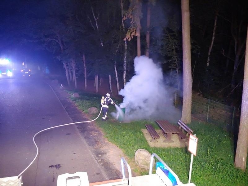 Kurz vor Mitternacht wurde durch einen aufmerksamen Autofahrer der Rettungsleitstelle Neubrandenburg ein brennender Müllcontainer auf dem Waldparkplatz an der B198 zwischen Wesenberg und Mirow gemeldet. Bei Ankunft am Einsatzort drang bereits starker Rauch aus dem Metallcontainer heraus. Das Feuer konnte mittels Schnellangriffseinrichtung des Löschfahrzeuges schnell gelöscht werden. Die eintreffenden Polizeibeamten nahmen den Schaden auf.