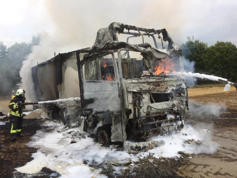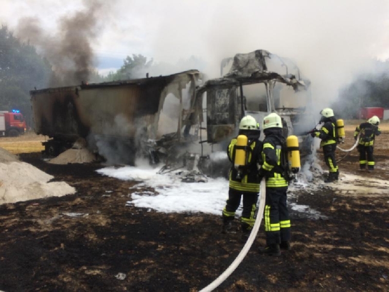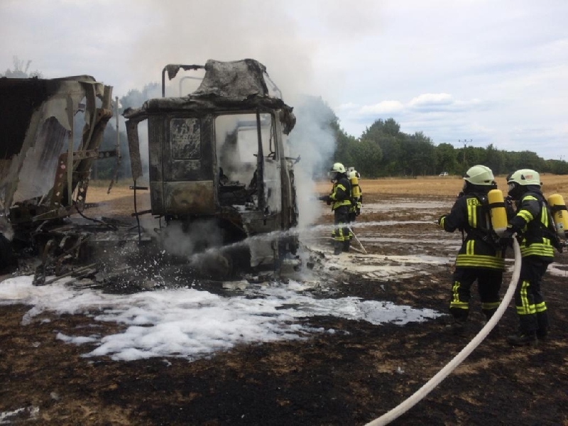 Heute Nachmittag wurden wir zusammen mit den Feuerwehren Strasen, Priepert, Wustrow und Mirow zu einem Lkw Brand zwischen den Ortschaften Strasen und Priepert alarmiert. Bei Ankunft stand bereits der gesamte Lkw in Volllbrand. Ebenfalls geriet auch die Ackerfläche in Brand, auf welcher der Lkw abgestellt war. Mit Löschschaum wurde der Brand gelöscht. Am Lkw und der Ackerfläche entstand ein Gesamtschaden von mehreren Hunderttausend Euro.