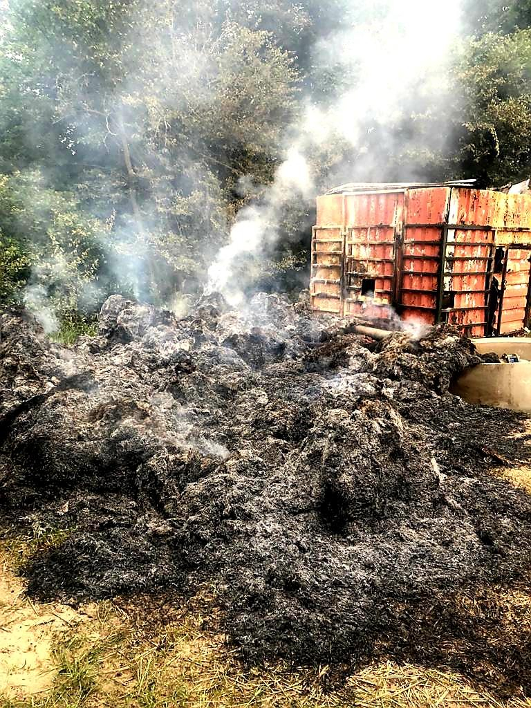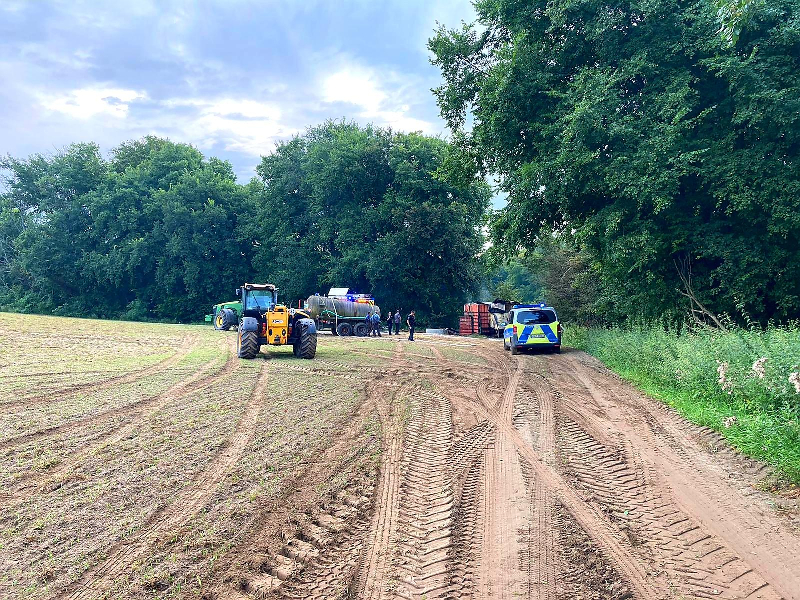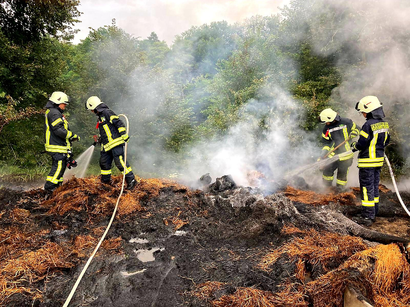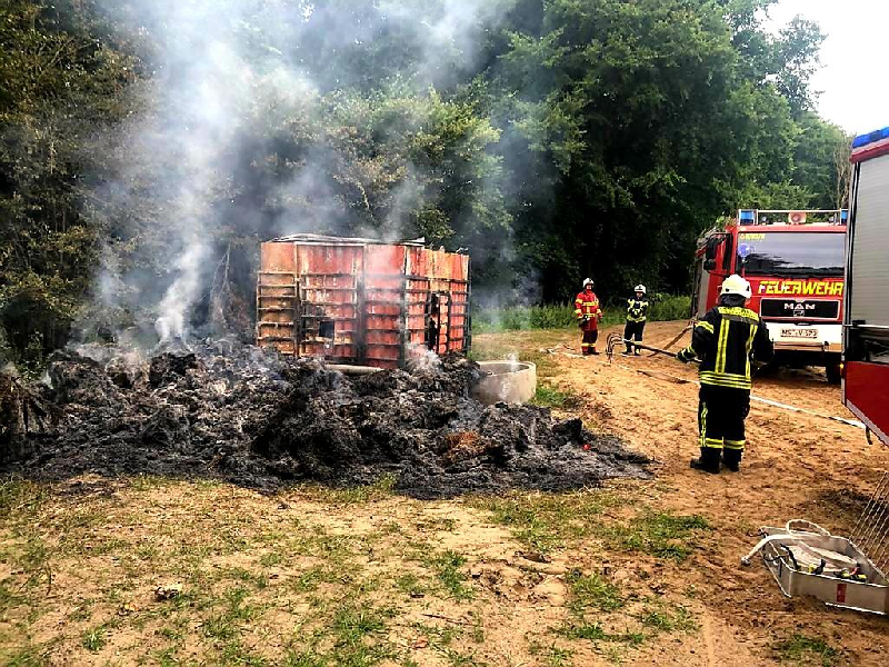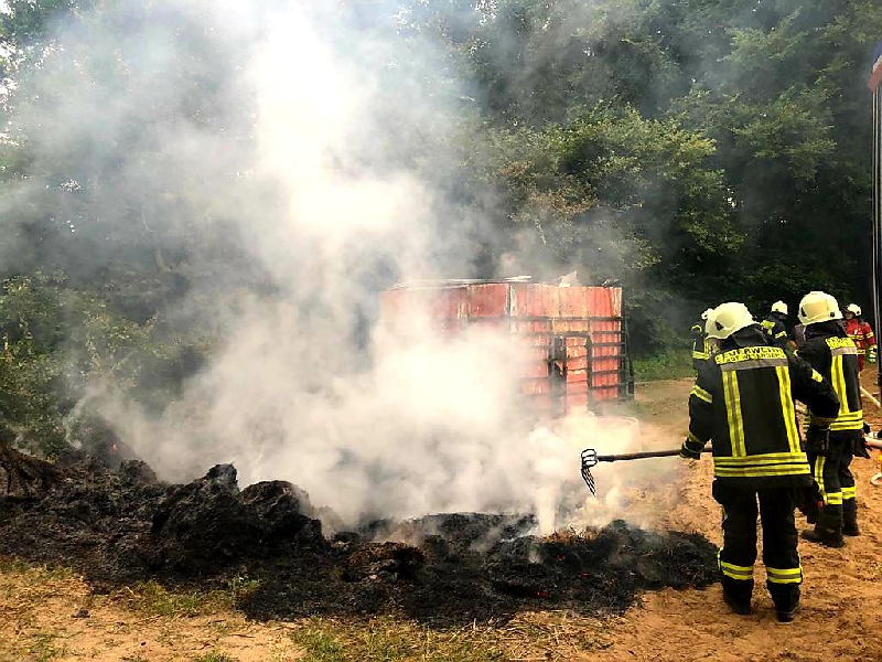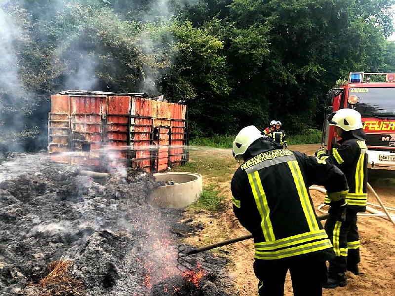 Am Morgen des 13.08.2021 um 06:30 Uhr wurden wir mit der Einsatzmeldung "Feuer mittel, Ahrensberg am Wildhof, Strohballenbrand am Pumpenhäuschen" alarmiert. Dank guter Einweisung durch Bürger und Mitarbeiter der Landwirtschaft konnten wir die recht abgelegene Einsatzstelle auf einem Acker zwischen Ahrensberg und Hartenland in der Nähe der Havel recht schnell finden. Bei unserem Eintreffen waren jedoch bereits ca. 12 Strohballen und ein Pumpenhäuschen samt Pumpe, welche für die Wasserversorgung in der Landwirtschaft genutzt wurde, nahezu vollständig abgebrannt. Das Feuer schien also über mehrere Stunden unentdeckt gebrannt zu haben. Wir brauchten lediglich eine Restablöschung und Nachkontrolle mit der Wärmebildkamera vornehmen. Mehr war hier nicht zu retten. Lobend zu erwähnen ist, dass der Landwirt schon vor unserem Eintreffen die Löschwasserproblematik erkannte und einen Wasserwagen mit 10 Kubik organisierte, sodass uns ein Pendelverkehr oder eine lange Wegestrecke erspart blieb. Als Brandursache kommen sowohl ein technischer Defekt der Pumpe, Selbstentzündung des Strohs oder auch Brandstiftung in Frage. Das herauszufinden ist jedoch Aufgabe der Polizei, an die wir die Einsatzstelle übergeben haben. Wir waren mit 10 Kameraden im Einsatz. Auch der stellvertretende Amtswehrführer machte sich kurz ein Bild von der Lage.