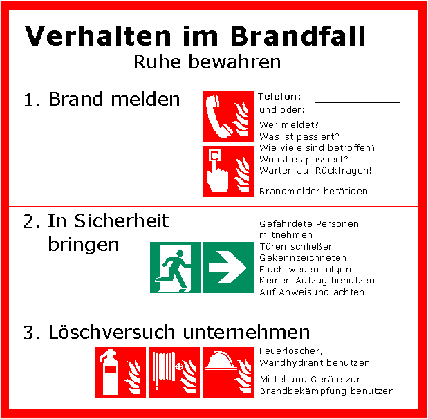 Beherzigen Sie diese Hinweise bitte auch an Ihrem Arbeitsplatz, im Urlaub und in der Freizeit. Machen Sie sich mit Standorten der Feuerlöscher, den Rettungswegen und Notausgängen sowie anderen Sicherheitseinrichtungen vertraut (z.B. in Hotels, Verwaltungsobjekten, Schiffen usw.).