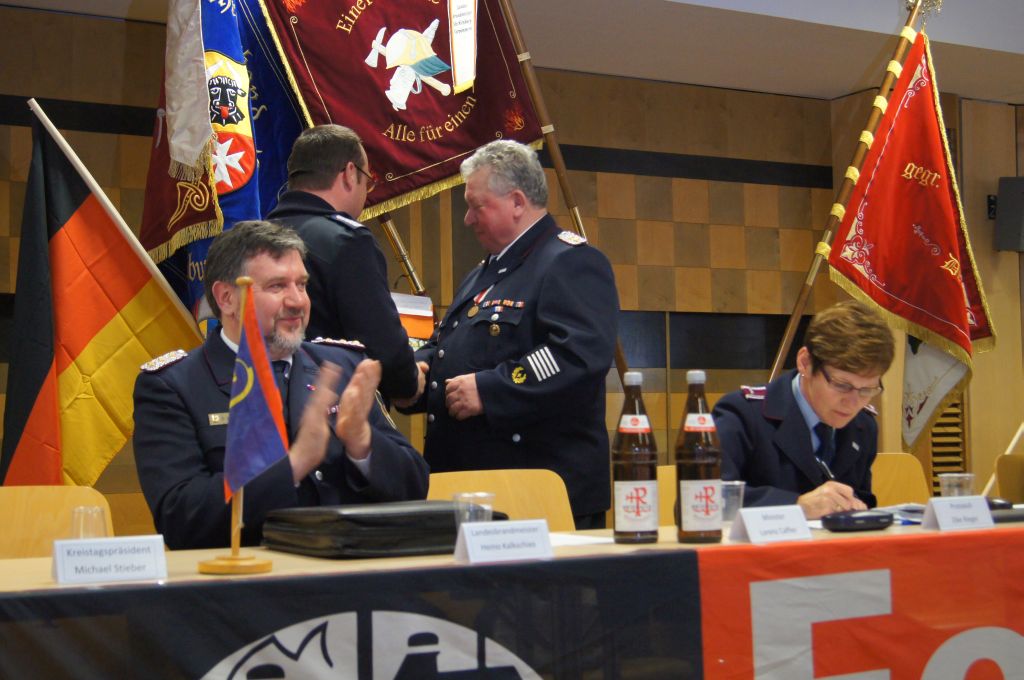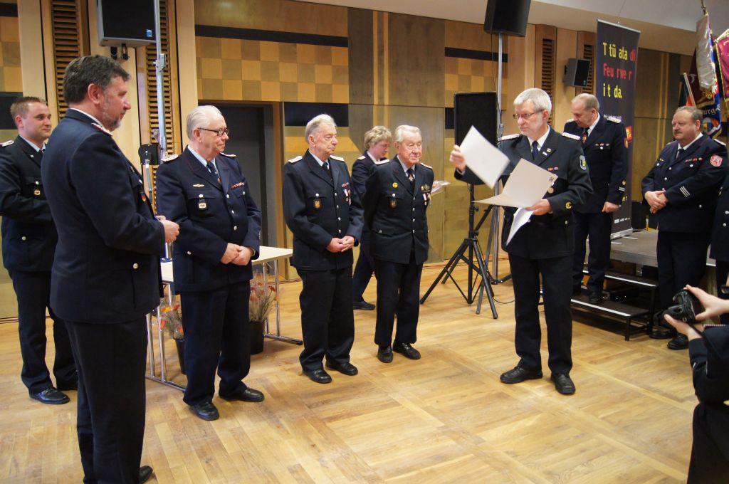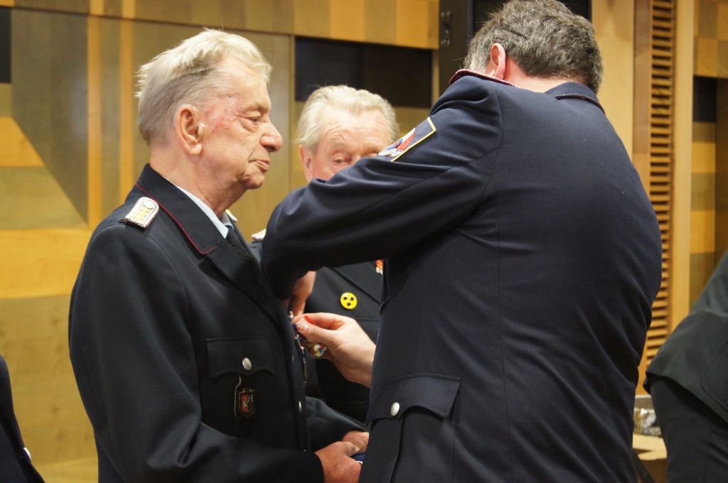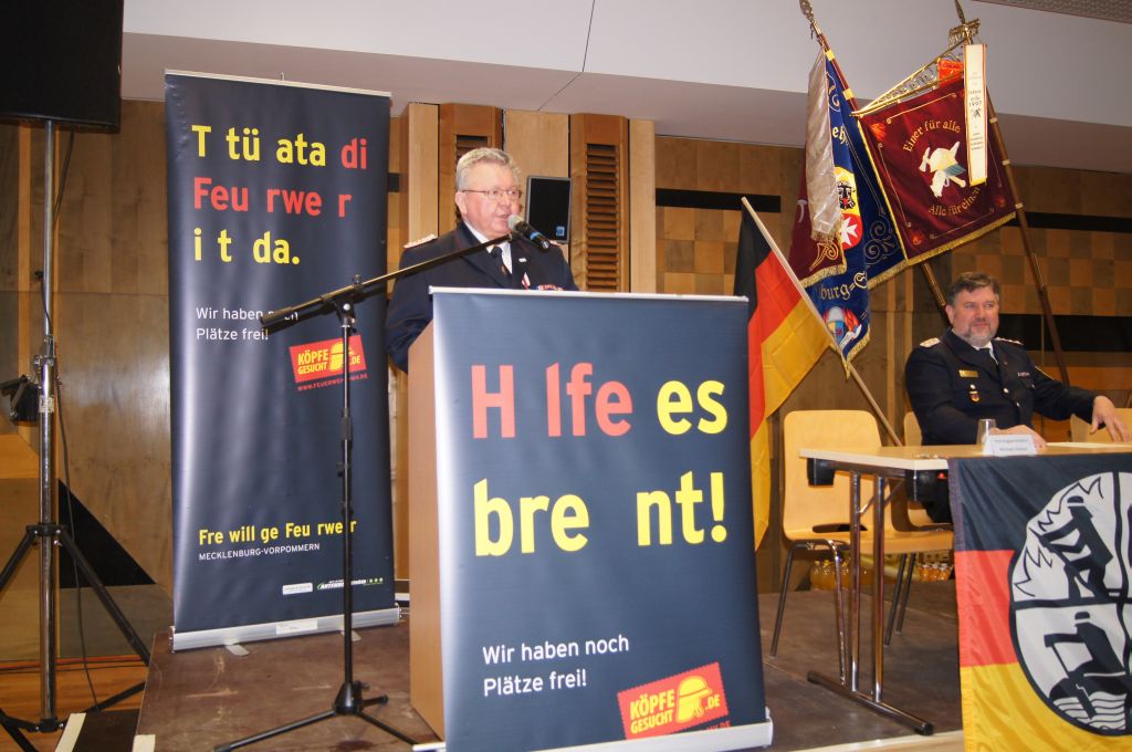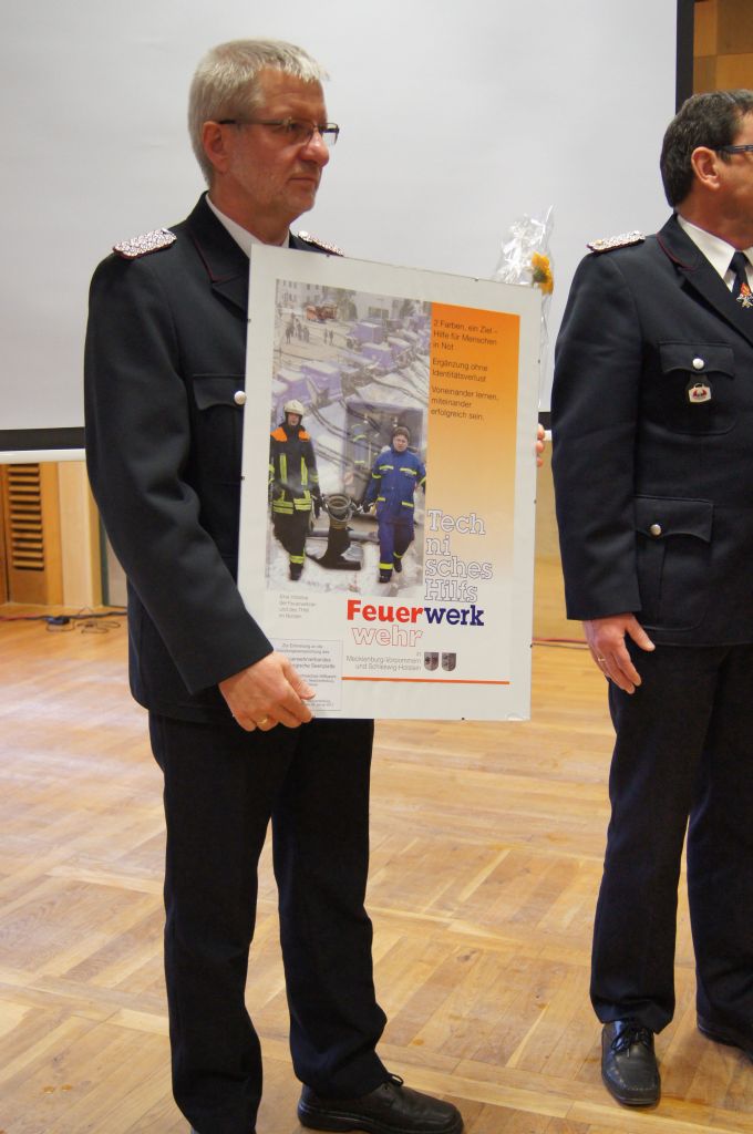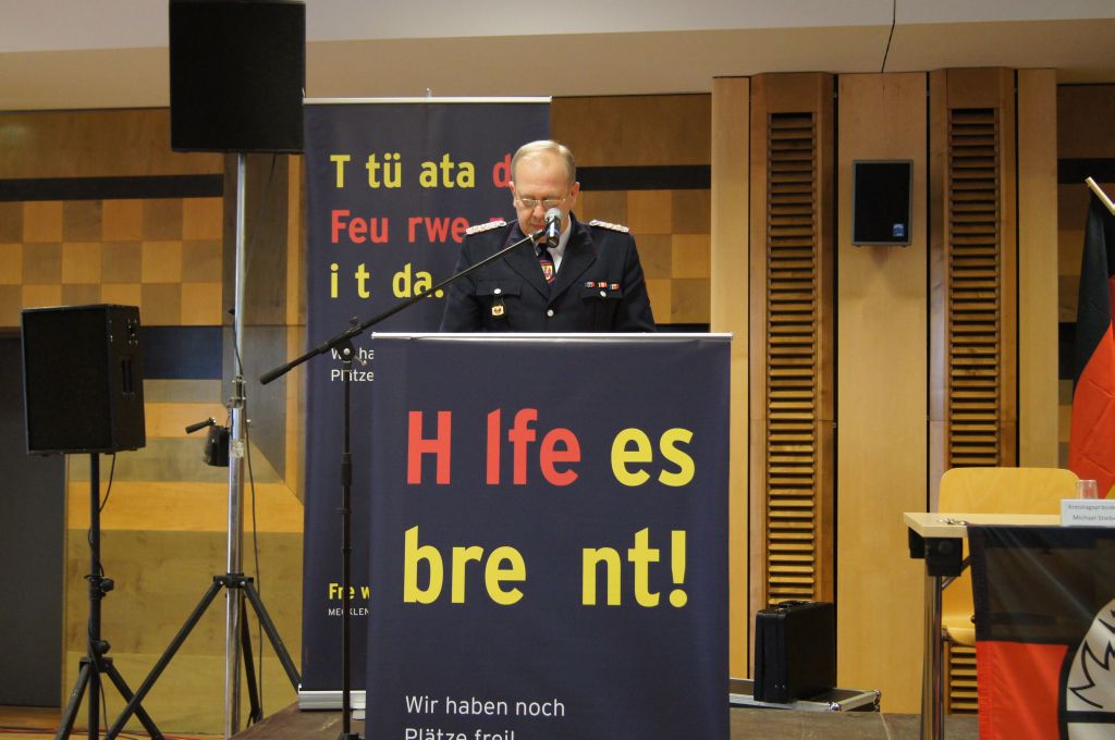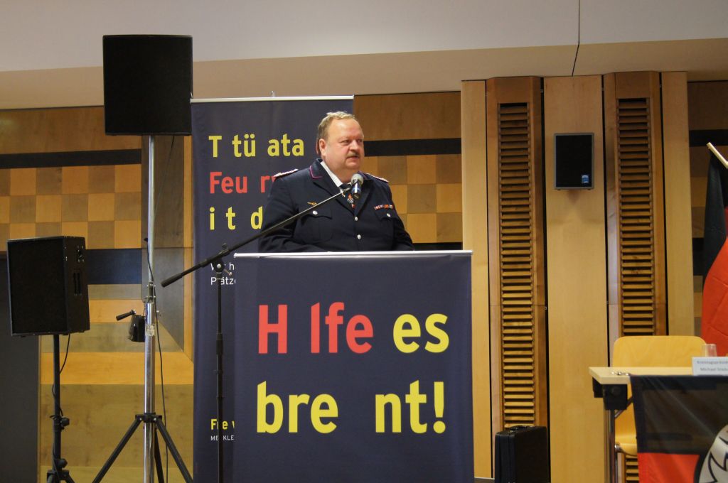 Als nächstes wurde dann die Aufnahme von Ehrenmitgliedern und der Übernahme der Ehrenmitglieder aus den Altkreisen (MST, DM, MUR, NB) beschlossen und auch gleich ein neues Ehrenmitglied ernannt. Unter minutenlangen, stehenden Applaus der Delegierten und Gäste wurde der ehemalige Kreiswehrführer Josef Augustin zum Ehrenkreiswehrführer a.D. ernannt. Den gleichen und vor allem respektvollen Applaus erhielten dann auch die drei darauf folgenden Kameraden, denn sie erhielten das Ehrenzeichen des Landesfeuerwehrverbandes Mecklenburg-Vorpommern für ihre 60- und 70-jährige Mitgliedschaft in einer Feuerwehr.