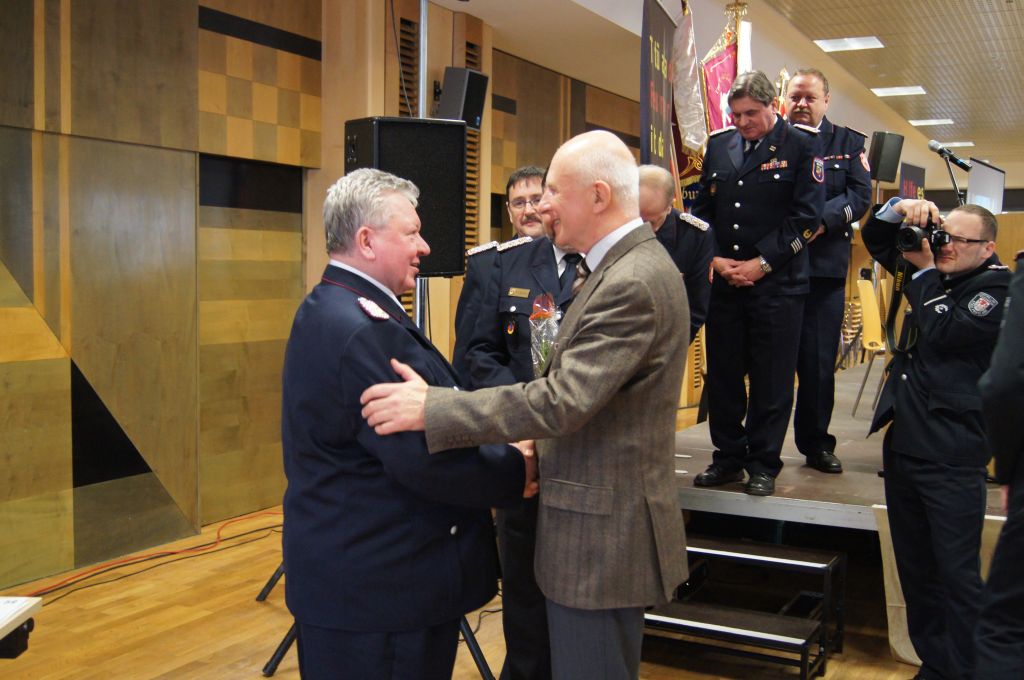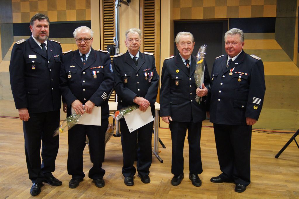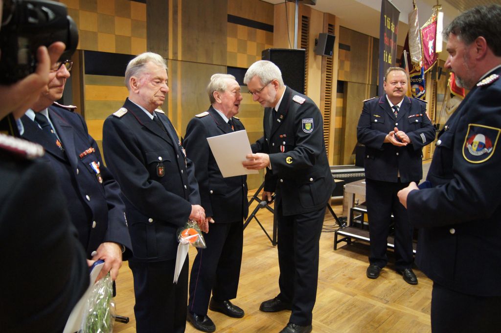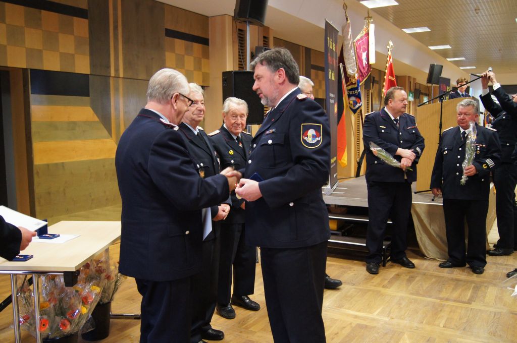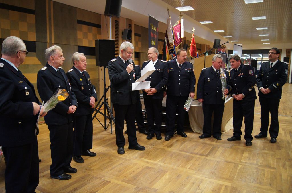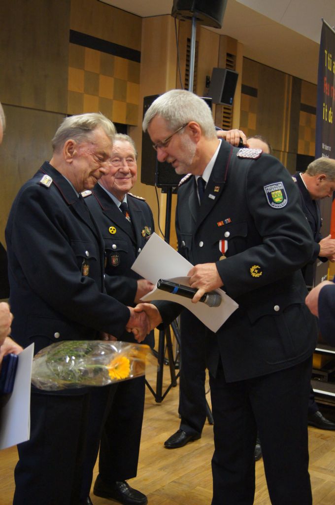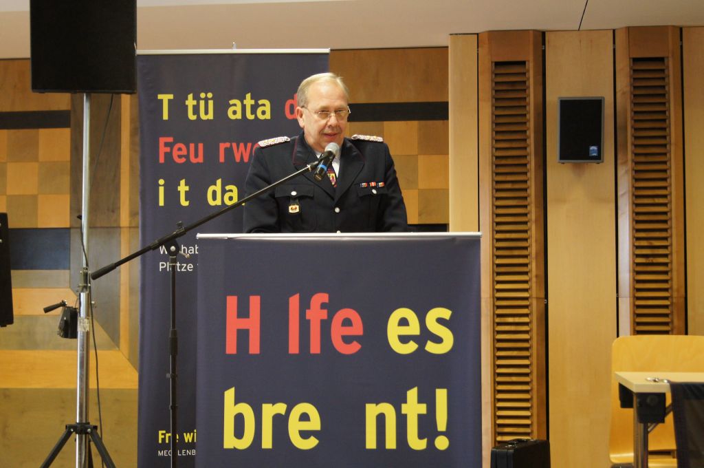Als nächstes wurde dann die Aufnahme von Ehrenmitgliedern und der Übernahme der Ehrenmitglieder aus den Altkreisen (MST, DM, MUR, NB) beschlossen und auch gleich ein neues Ehrenmitglied ernannt. Unter minutenlangen, stehenden Applaus der Delegierten und Gäste wurde der ehemalige Kreiswehrführer Josef Augustin zum Ehrenkreiswehrführer a.D. ernannt. Den gleichen und vor allem respektvollen Applaus erhielten dann auch die drei darauf folgenden Kameraden, denn sie erhielten das Ehrenzeichen des Landesfeuerwehrverbandes Mecklenburg-Vorpommern für ihre 60- und 70-jährige Mitgliedschaft in einer Feuerwehr.