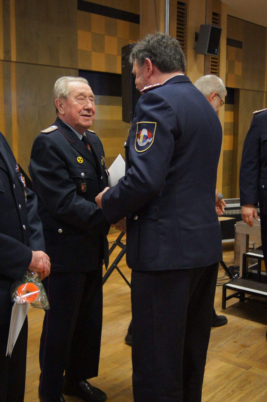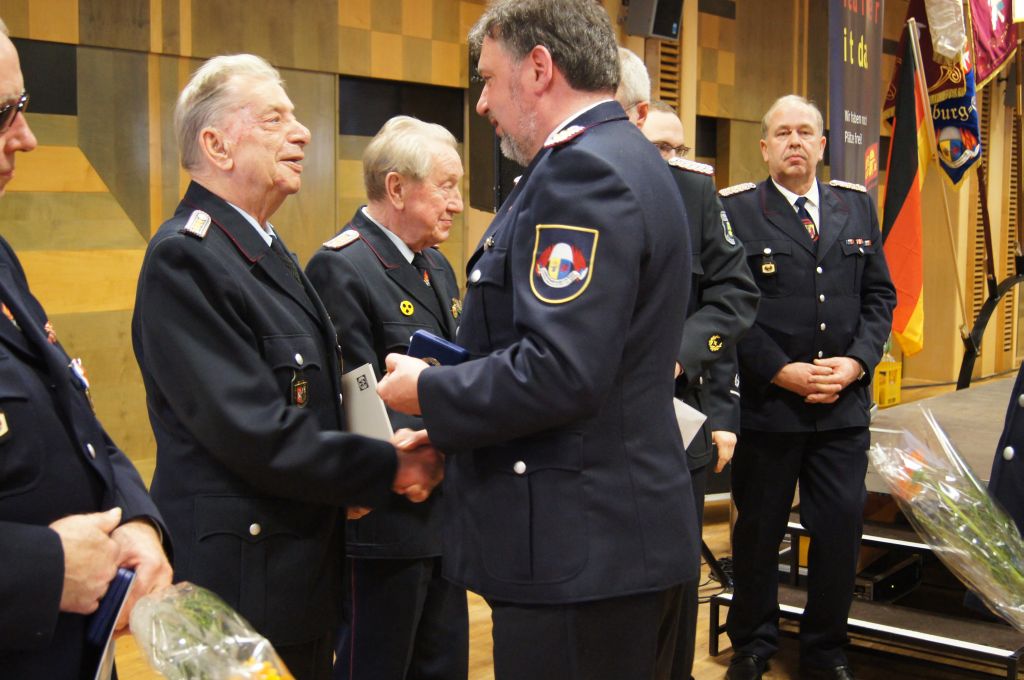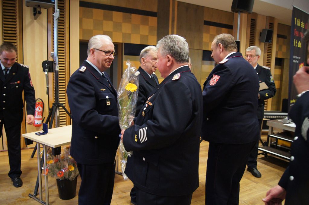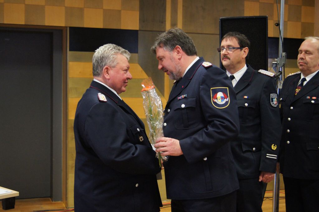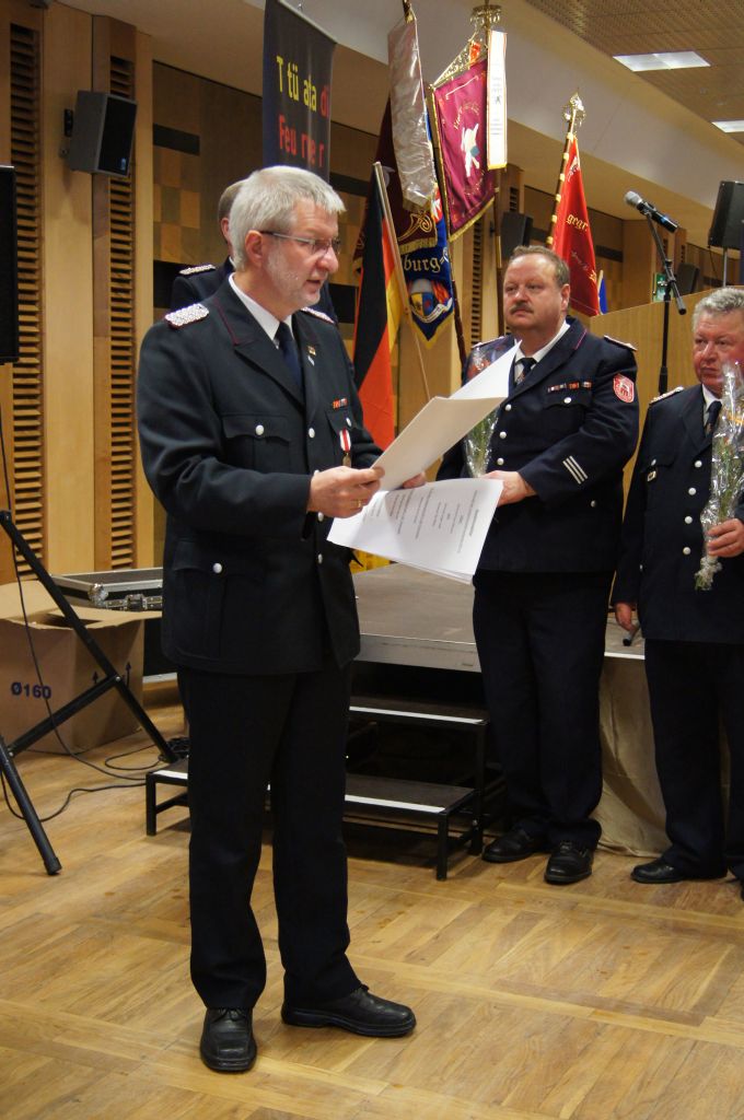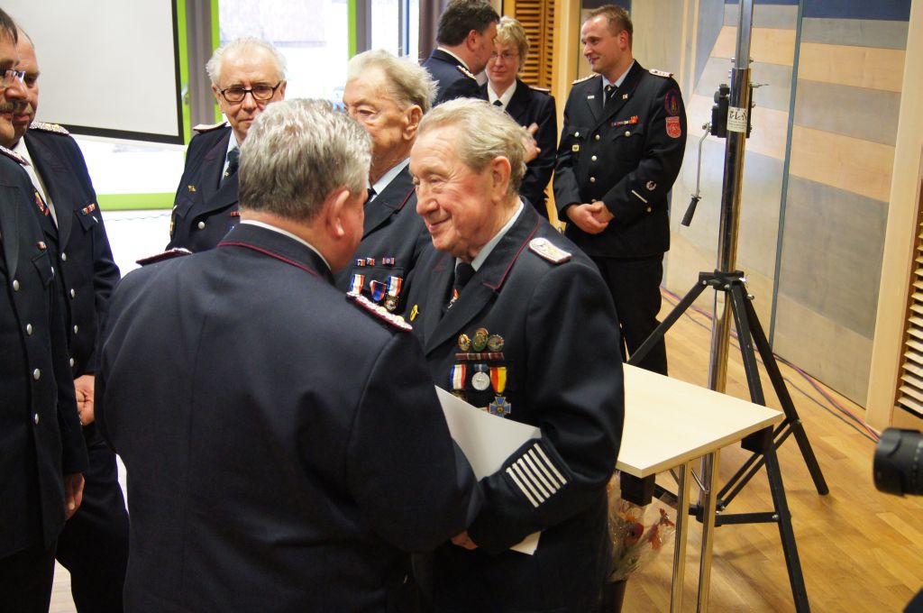 Als nächstes wurde dann die Aufnahme von Ehrenmitgliedern und der Übernahme der Ehrenmitglieder aus den Altkreisen (MST, DM, MUR, NB) beschlossen und auch gleich ein neues Ehrenmitglied ernannt. Unter minutenlangen, stehenden Applaus der Delegierten und Gäste wurde der ehemalige Kreiswehrführer Josef Augustin zum Ehrenkreiswehrführer a.D. ernannt. Den gleichen und vor allem respektvollen Applaus erhielten dann auch die drei darauf folgenden Kameraden, denn sie erhielten das Ehrenzeichen des Landesfeuerwehrverbandes Mecklenburg-Vorpommern für ihre 60- und 70-jährige Mitgliedschaft in einer Feuerwehr.