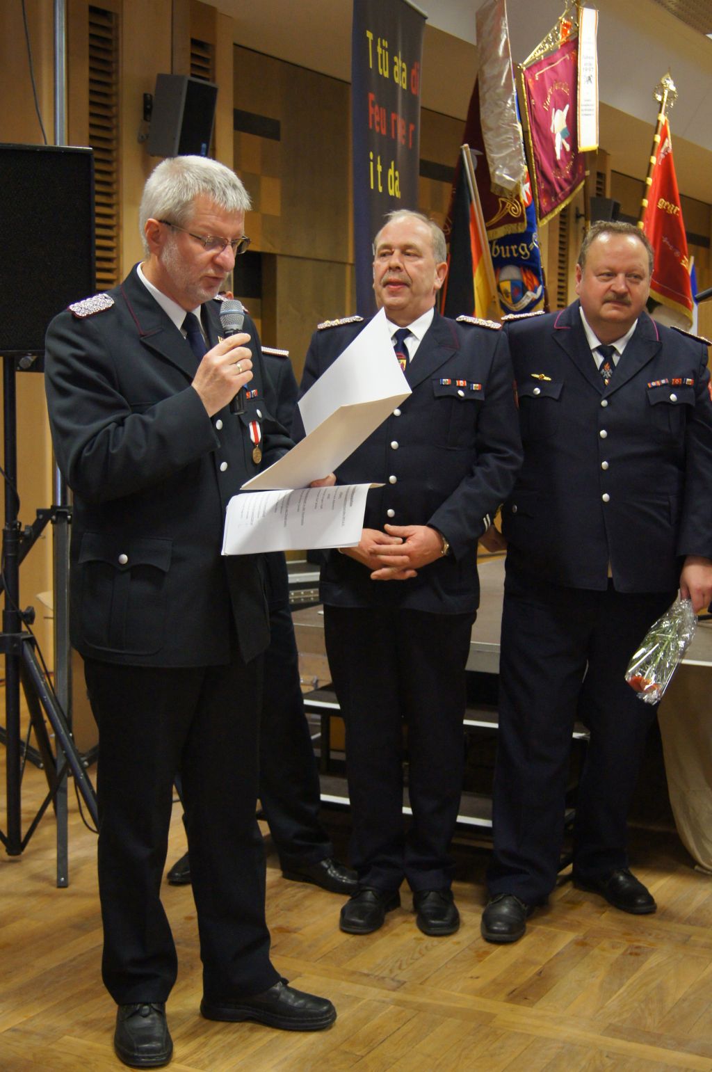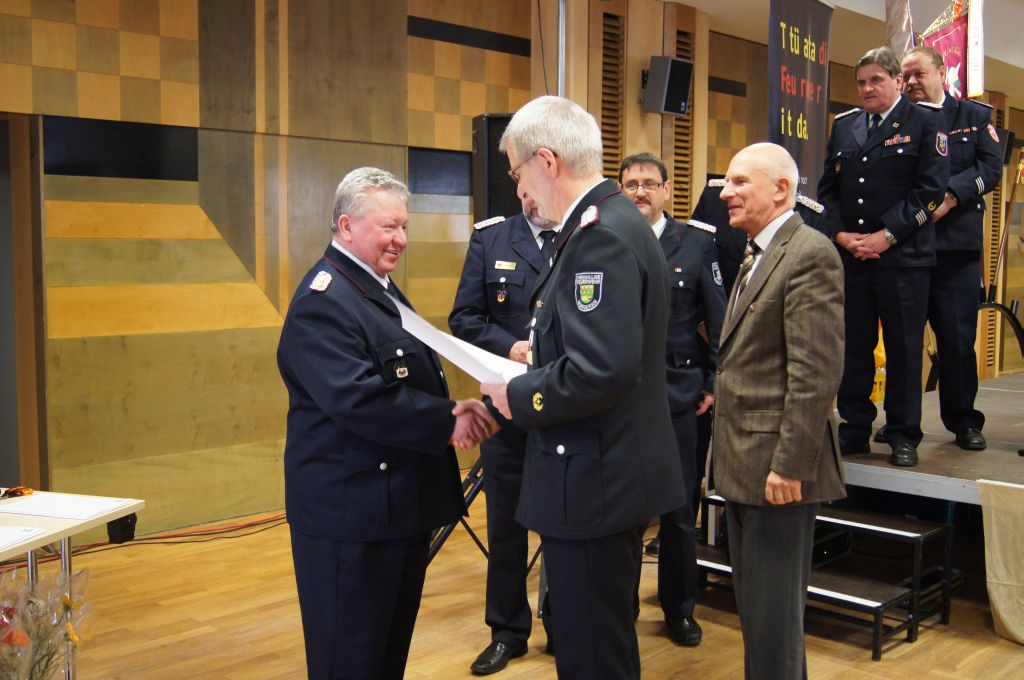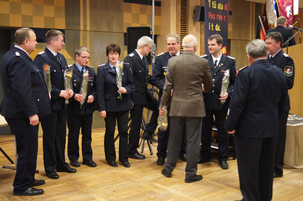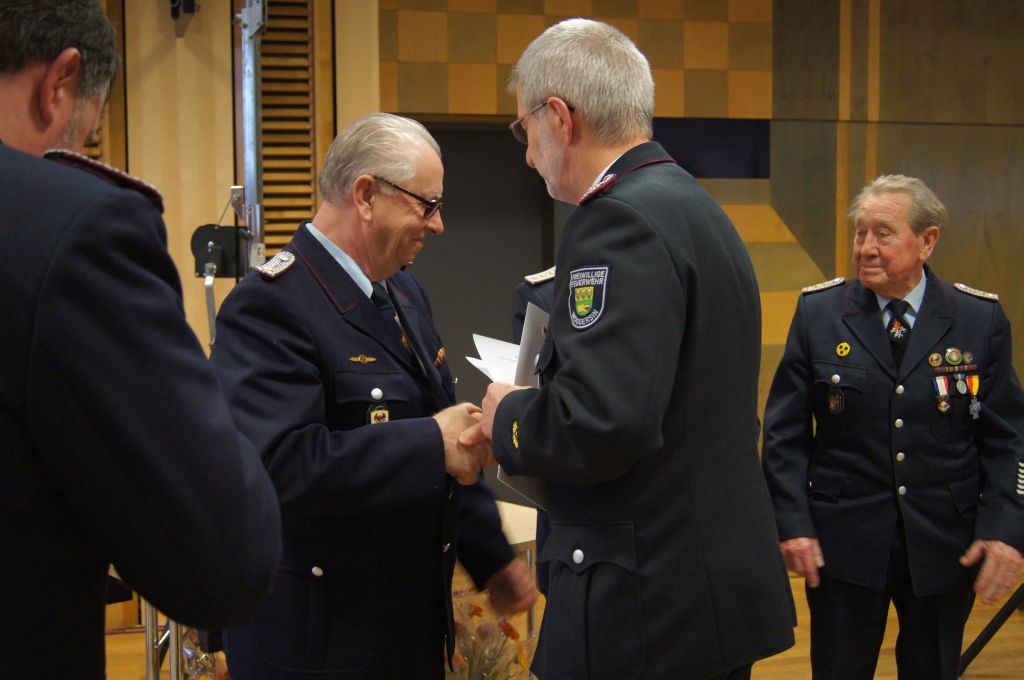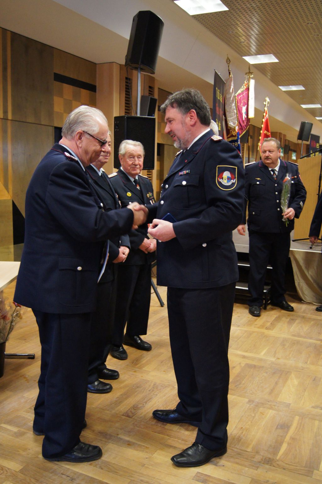 Als nächstes wurde dann die Aufnahme von Ehrenmitgliedern und der Übernahme der Ehrenmitglieder aus den Altkreisen (MST, DM, MUR, NB) beschlossen und auch gleich ein neues Ehrenmitglied ernannt. Unter minutenlangen, stehenden Applaus der Delegierten und Gäste wurde der ehemalige Kreiswehrführer Josef Augustin zum Ehrenkreiswehrführer a.D. ernannt. Den gleichen und vor allem respektvollen Applaus erhielten dann auch die drei darauf folgenden Kameraden, denn sie erhielten das Ehrenzeichen des Landesfeuerwehrverbandes Mecklenburg-Vorpommern für ihre 60- und 70-jährige Mitgliedschaft in einer Feuerwehr.