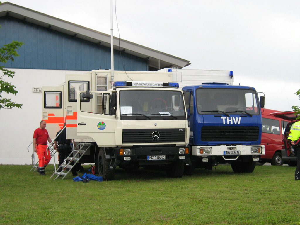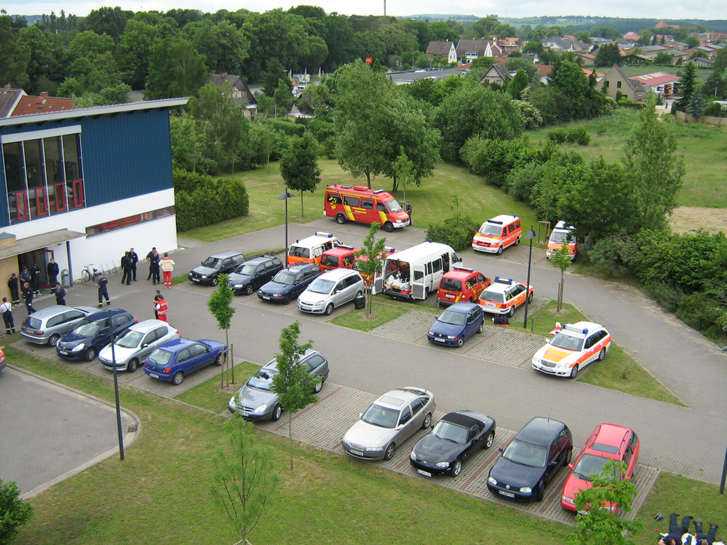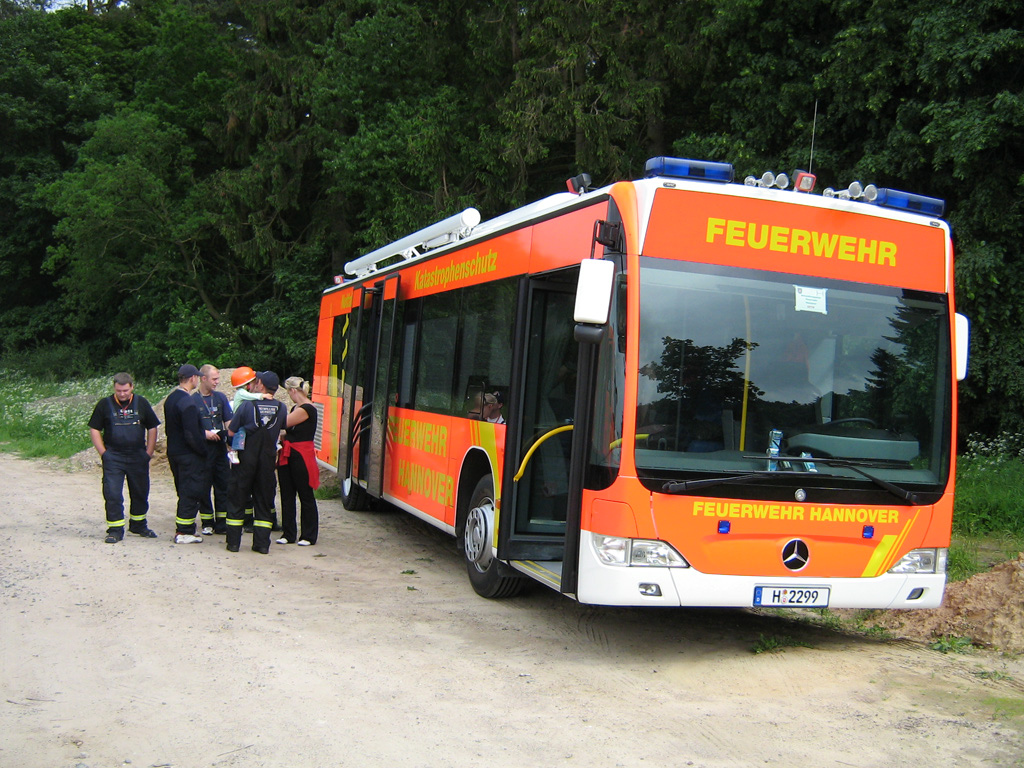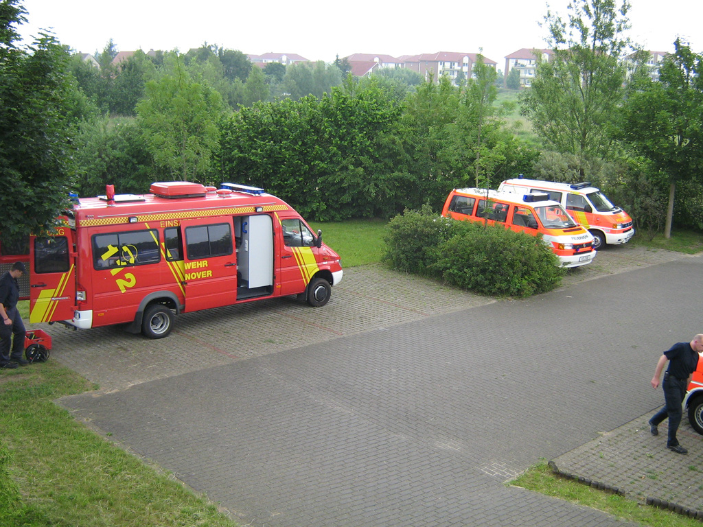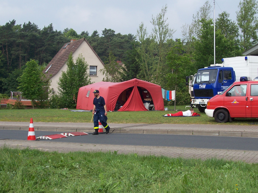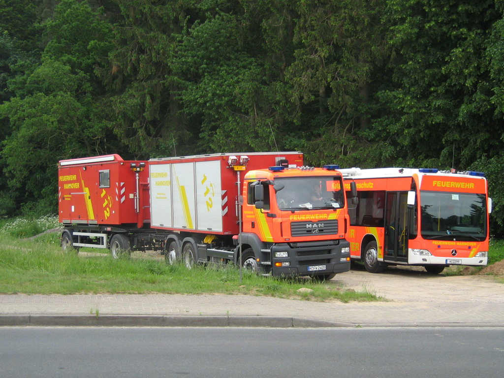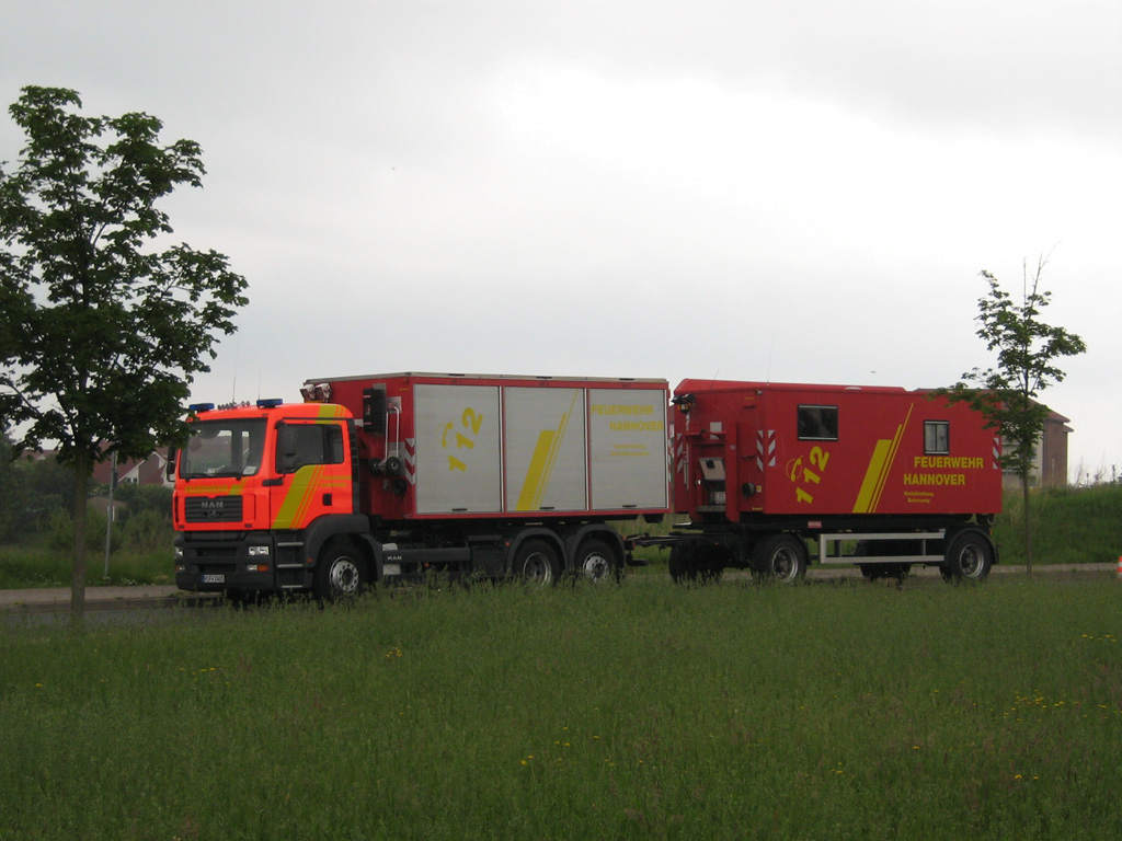 Ab dem 2. Tag mussten wir einen 12-Stunden-Tag (von 09:00 - 21:00 Uhr) schieben, was für uns nicht schwer fiel, denn wir verbrachten die Zeit unter anderem mit Dart- oder Gesellschaftsspielen. Zum Mittag fuhren wir immer mit dem ganzen Zug in die Stadt Laage, was immer sehr lecker und reichhaltig war. Wir wurden sogar in die Arbeitsabläufe eingebunden, so hatten wir zum Beispiel von Montag bis Donnerstag Küchendienst (Frühstück, Kaffee und Abendessen vorbereiten). Da schon am Dienstagabend George W. Bush am Flugplatz Rostock-Laage landete, bekamen wir Besuch von der Berufsfeuerwehr Hannover, die mit einem großen Notfallrettungs-Zug (Bilder unten) bei der Feuerwehr Laage für einen Tag halt machte. Hinzu kam dann noch das THW und Kameraden von der Berufsfeuerwehr Stralsund, die mit einem großen Einsatzleitwagen bis Donnerstag bei uns blieben.