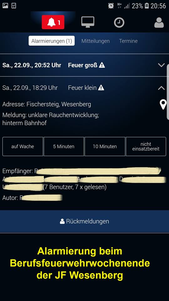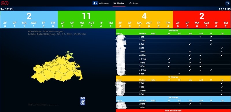Ab jetzt kann jede Einsatzkraft über die App seinen persönlichen Status über die zeitliche Erreichbarkeit zu Einsätzen eintragen, d.h. der/die Kamerad/-in kann schon im Vorfeld bekannt geben, ob er/sie bei einem Einsatz in 5 min. oder 10 min. am Feuerwehrgerätehaus erscheint, bzw. über "nicht einsatzbereit" gar nicht für Einsätze zur Verfügung steht. Diese Daten werden dann allen Einsatzkräften auf einem Monitor dargestellt. Gerade für die Führungskräfte ist so eine bessere Übersicht der Tageseinsatzbereitschaft ersichtlich. Über eine Schnittstelle ist das Programm auch direkt mit der integrierten Rettungsleitstelle Neubrandenburg verbunden. Sollte nun eine Alarmierung per Divera 24/7 erfolgen, kann die Teilnahme noch einmal quittiert werden.